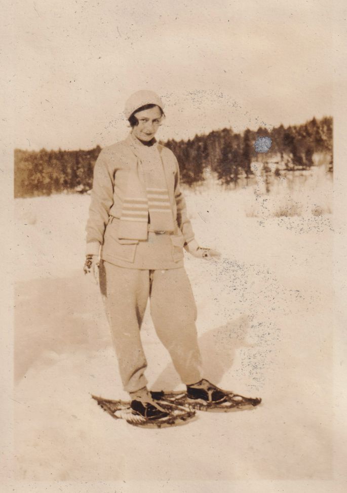 Black-and-White photograph of Amy Jones on snowshoes. She is wearing a striped scarf and patterned mittens.