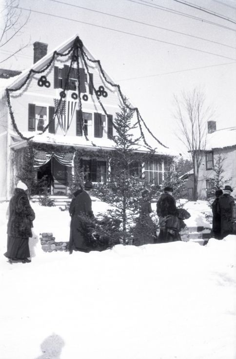 Negative of a house with wreaths and tinsel decorations on its front, maybe decorated for Winter Carnival. Most likely taken by Mary Ives Baldwin. This item is not fully cataloged but has been uploaded so the image is publicly available; if you would like us to prioritize cataloging this item, please contact the HSL Collections team.
