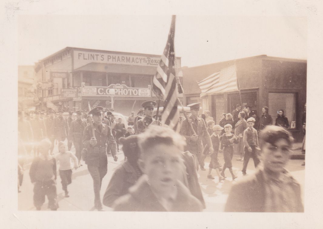 Black and white photograph of a parade on Broadway. There are two boys in the foreground with a group of soldiers behind them. Flint's Pharmacy and C.C. Photo can be seen in the background.
