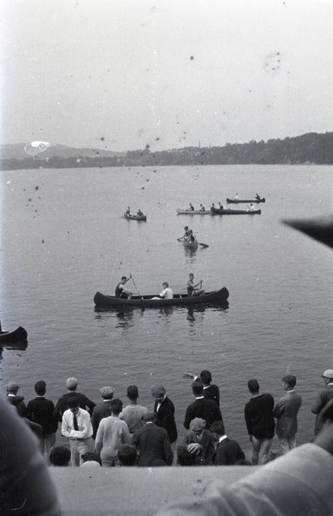 Negative of multiple canoes and other boats out on a body of water. There is a group of spectators watching the boats from land at the bottom of the negative. Most likely taken by Henry Ives Baldwin. This item is not fully cataloged but has been uploaded so the image is publicly available; if you would like us to prioritize cataloging this item, please contact the HSL Collections team.