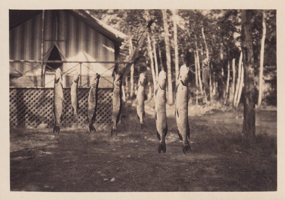 Black-and-White photograph of fish hanging on a line. A platform tent site camp can be seen in the background. The photograph was likely printed by Kollecker's Kodak and Gift Shop.