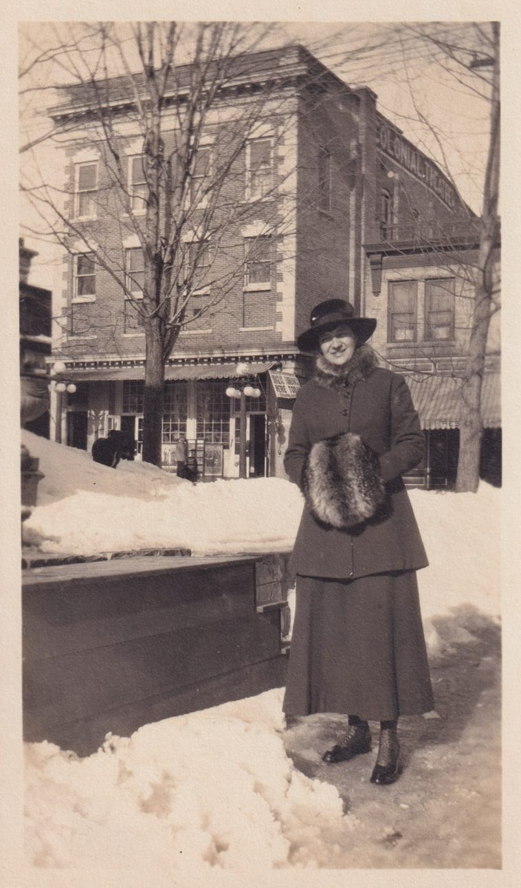 Black-and-White photograph of an unidentified woman in winter gear with a fur muff. She is standing in the lot across from the Colonial Theatre Building at 55 Broadway. The photograph was likely printed by Kollecker's Kodak and Gift Shop.