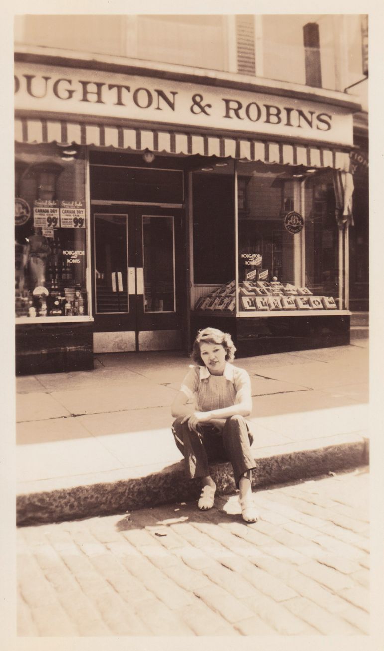 Black-and-White photograph of a woman seated on a curb. The shop behind her has a sign reading [?]oughton & Robins. Was in an envelope marked, "Hoffman, Monday Jul 12 1937." Photograph was developed by Kollecker's Kodak and Gift Shop. Negative is 2024.2.36.20.