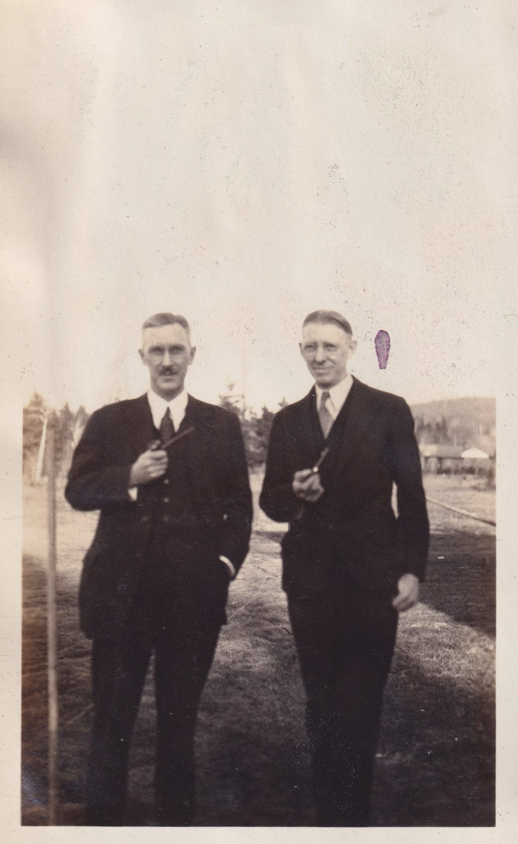 Black-and-White photograph of two unidentified men standing outdoors. They are both wearing suits and holding pipes. Part of album 2024.21.1, kept by Amy Jones and David Blair Jones c. 1930-1934.