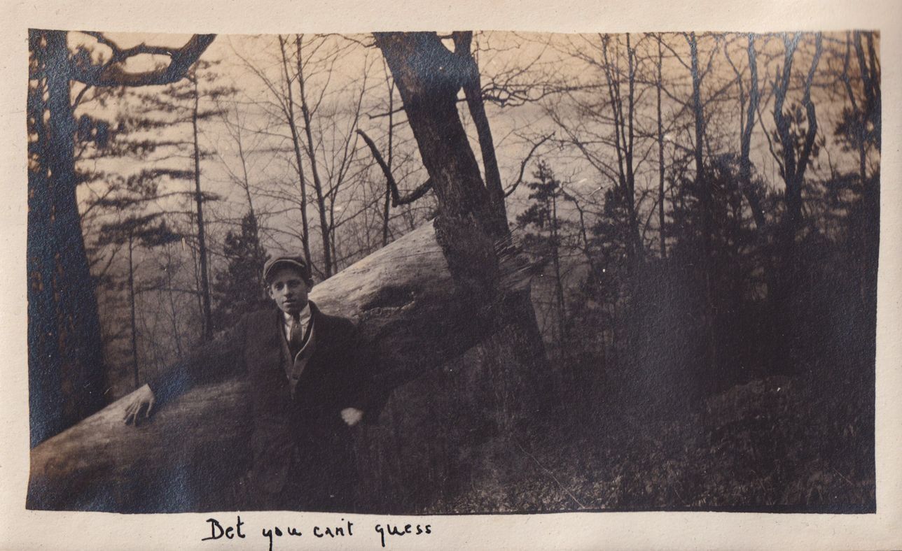 Black-and-white photograph of a man leaning against a fallen tree trunk on an incline. There are many trees around and behind him. "Bet you can't guess" is written in ink beneath the photograph.