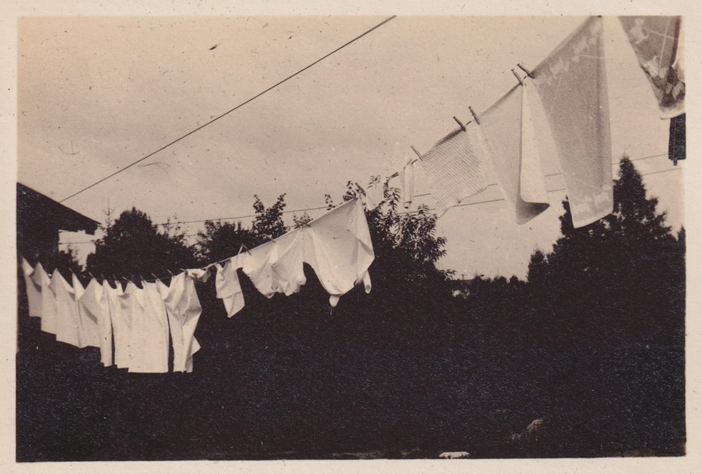 Black-and-White photograph of baby Lucy Jones’ laundry hanging out on the clothesline. Part of album 2024.21.1, kept by Amy Jones and David Blair Jones c. 1930-1934.