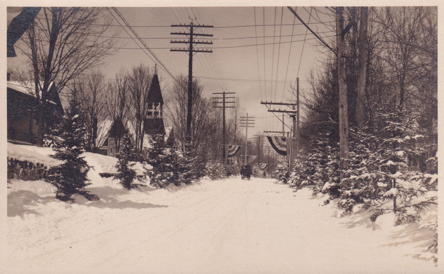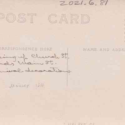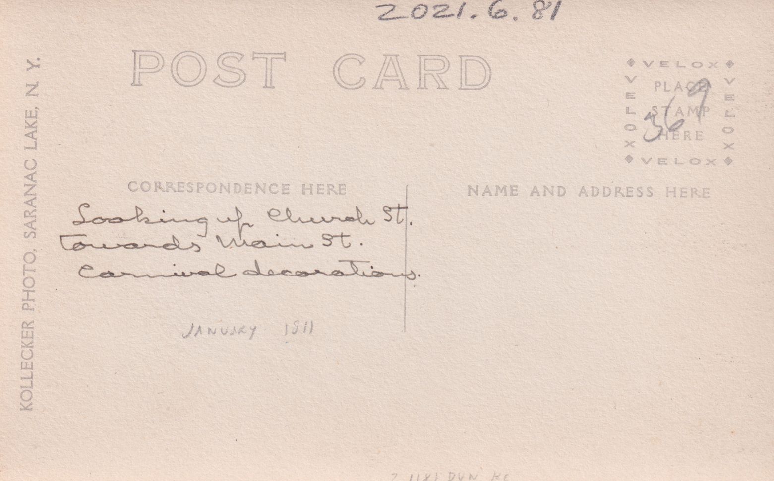 Black and white photo postcard of Church Street decorated for Winter Carnival. The steeple of the Church of St. Luke can be seen on the left side of hte image. Handwritten on the reverse is "Looking up Church St. towards Main St. Carnival decorations" and "January 1911." Printed along the side of the back is "Kollecker Photo, Saranac Lake, N. Y."