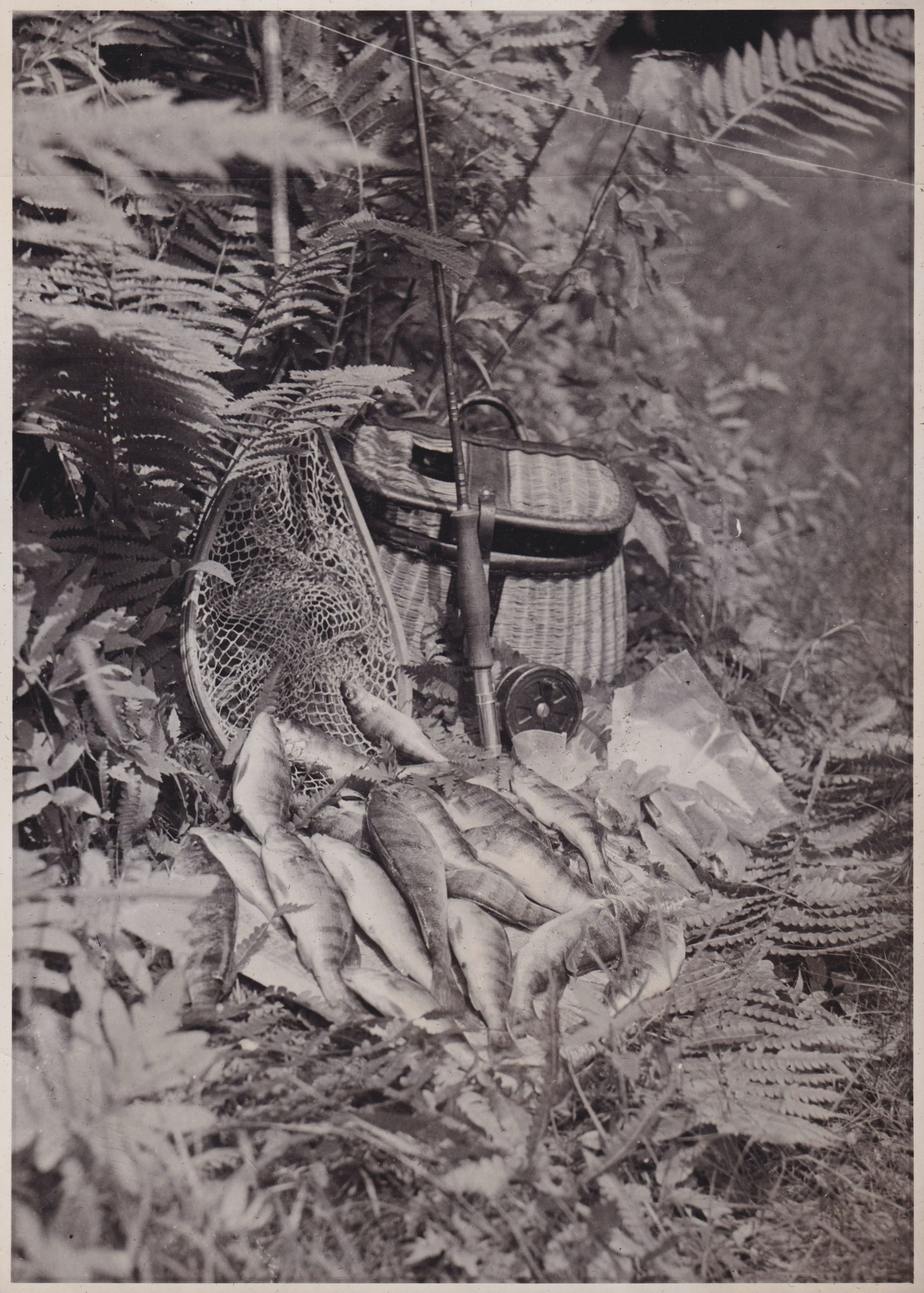 Black-and-White photograph of fish laid out in the grass in front of a fishing creel and rod.