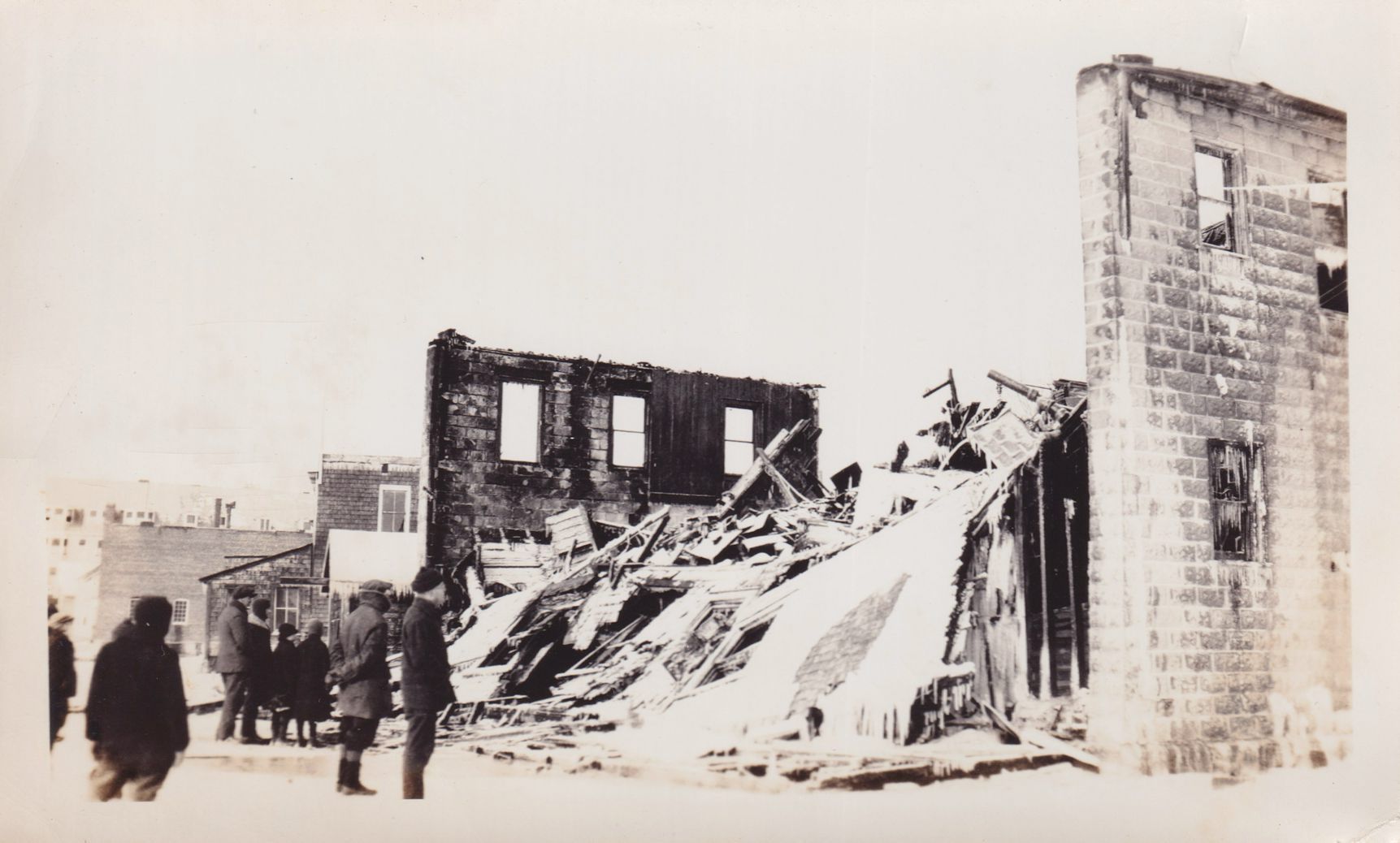 Black-and-White photograph of the aftermath of a building fire. There are people standing next to the building. The building has largely collapsed, with the two standing walls. The photograph was likely printed by Kollecker's Kodak and Gift Shop.