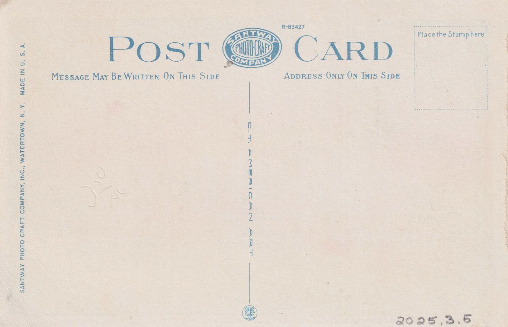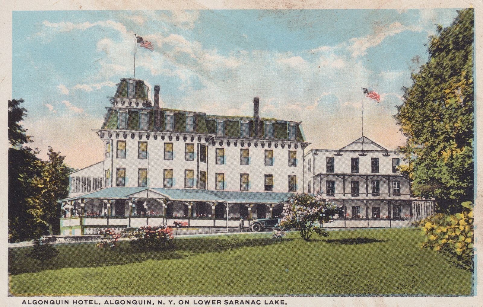 Color postcard showing the side of the Algonquin Hotel. Printed caption on front reads, "Algonquin Hotel, Algonquin, N. Y. on Lower Saranac Lake." Printed by Santway Photo-Craft Company, Inc., Watertown, NY. Unused, divided back, white border.Subject Place