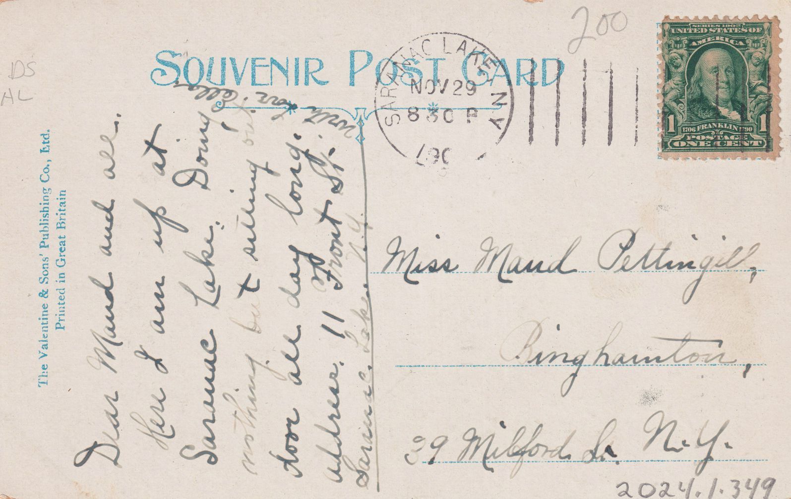 Postcard with an image of Main Street along the side of St. Luke's Church. The postcard is addressed to Miss Maud Pettingill.