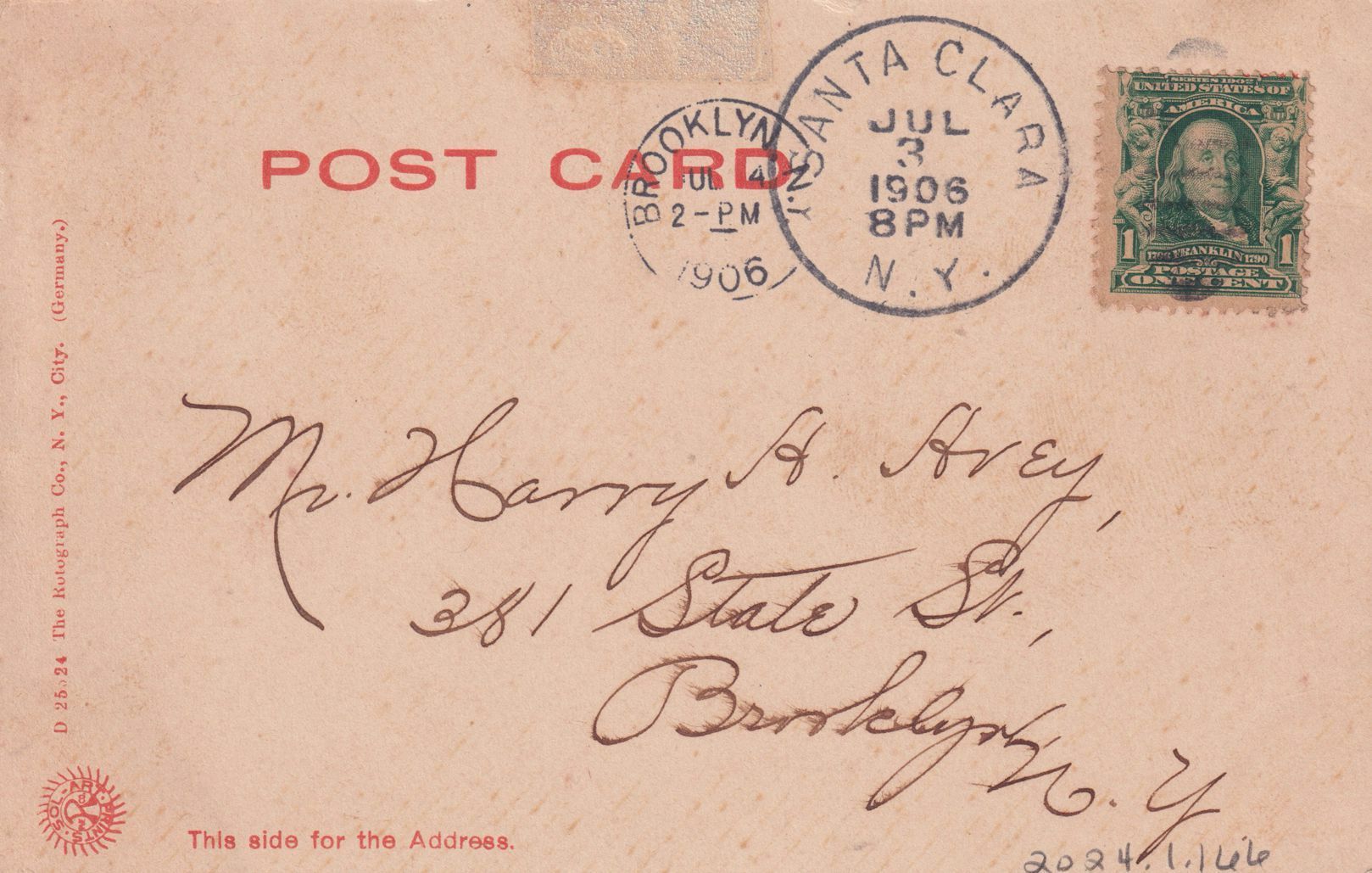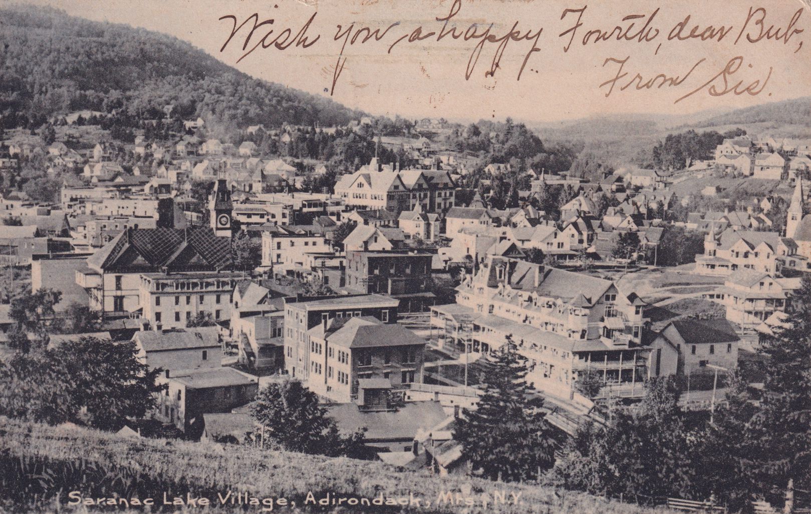 Black-and-white postcard of the view of downtown Saranac Lake from Blood Hill/Lake Street Hill. Many downtown buildings, including the original Harrietstown Town Hall and first Saranac Lake High School, are visible. Printed caption on front reads, "Saranac Lake Village, Adirondack, Mts. N. Y." Printed by the Rotograph Co., NYC. Used, undivided back, postmarked Santa Clara, NY, July 3, 1906. Handwritten message above skyline on front reads, "Wish you a happy Fourth, dear Bub, from Sis." Mailed to Mr. Harry A. Avery, 381 State Street, Brooklyn, NY.Subject Place