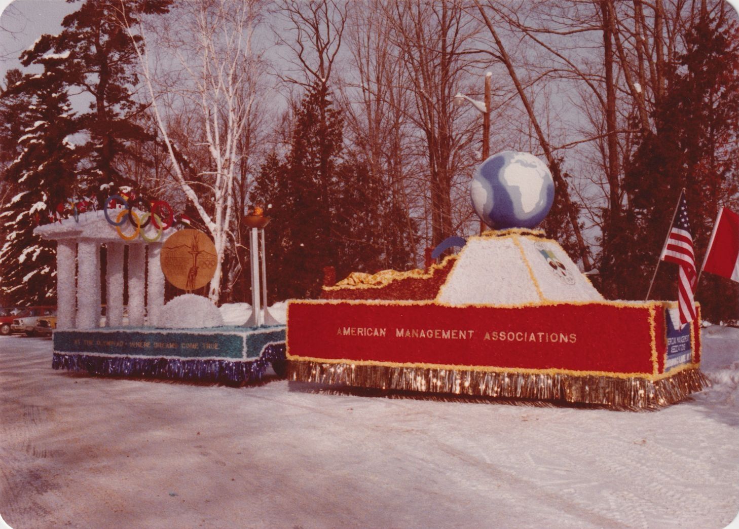Color photograph of a Winter Carnival float. The float is composed of two pieces, the first of which has a globe sitting on top of a white trapezoid. That part of the float says "American Management Associations" on the side. The other part of the float has Greek columns, a large fake flame and medal, and the Olympic rings. It says "At the Olympiad -- Where Dreams Come True" on the side. This photograph is from an album of photographs taken by staff of the American Management Association.