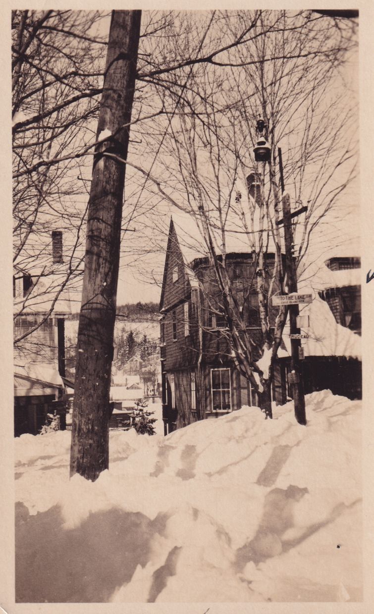 Black and white photograph of two houses covered in snow with large snow drifts in front of them. There are two signs on a pole in the right side of the photograph, one says "To the Lake," and the other says "Trudeau."