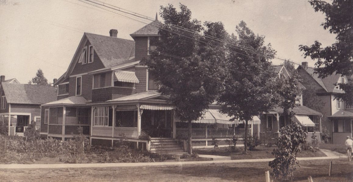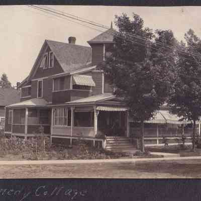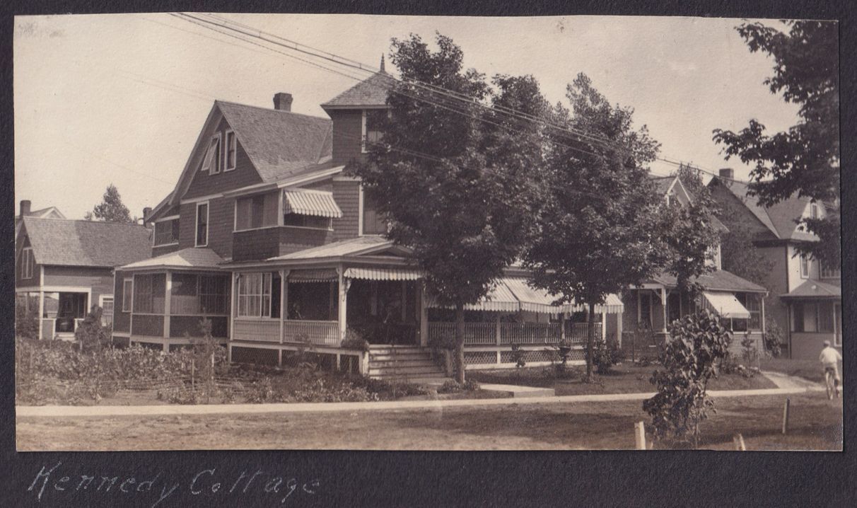 Black-and-white photograph of Kennedy Cottage on Shepard Avenue. The cottage has three stories, a large front porch, and at least one sleeping porch on the second floor. "Kennedy Cottage" is written in white beneath the photograph.