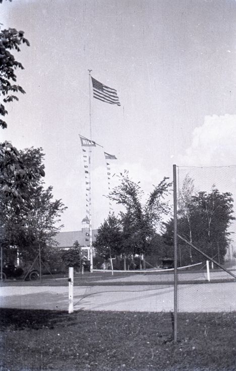 Negative of a tennis court with a flag pole flying the American flag with two smaller flags with lines of even smaller flags attached to them in the background. One of the small flags says "Hill" and the other most likely says "Hotchkiss." Most likely taken by Mary Ives Baldwin. This item is not fully cataloged but has been uploaded so the image is publicly available; if you would like us to prioritize cataloging this item, please contact the HSL Collections team.