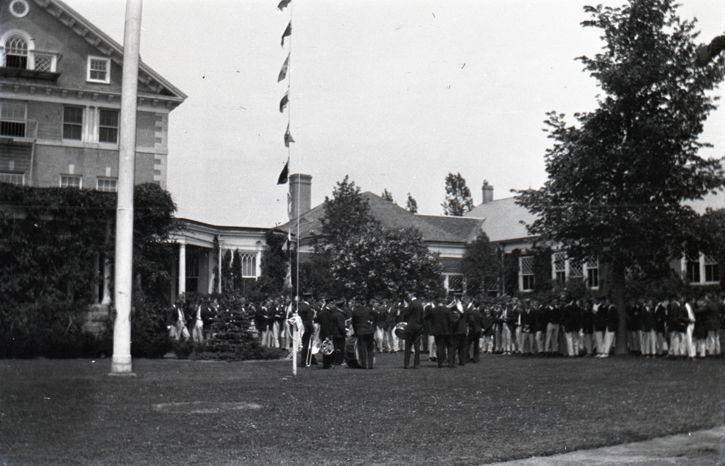 Negative of many unidentified young men standing outside of a school building. A smaller group of men holding instruments stands together near the base of a flag pole. Most likely taken by Mary Ives Baldwin. This item is not fully cataloged but has been uploaded so the image is publicly available; if you would like us to prioritize cataloging this item, please contact the HSL Collections team.