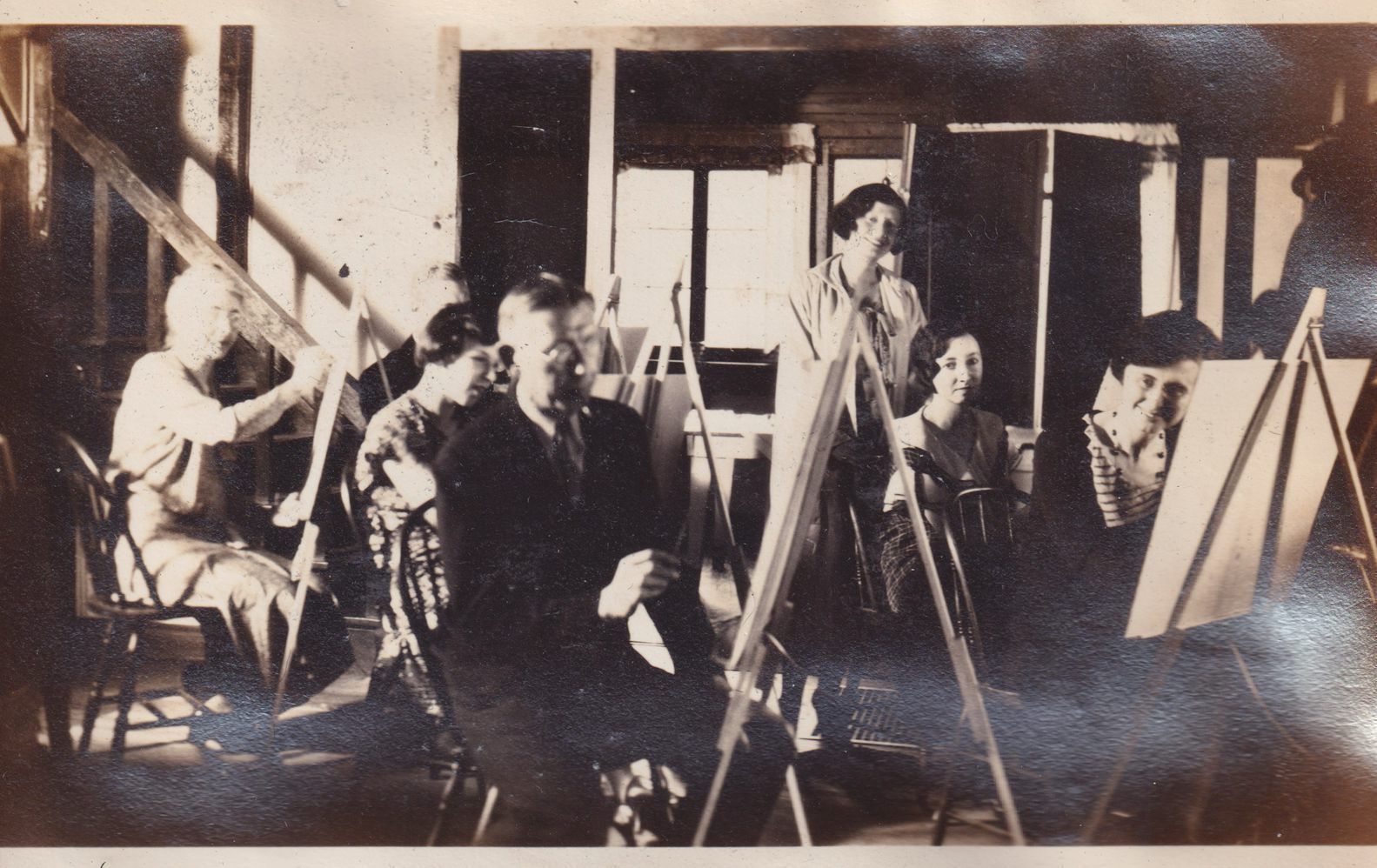 Black-and-White photograph of Amy Jones (standing) teaching an art class inside Danforth Cottage.