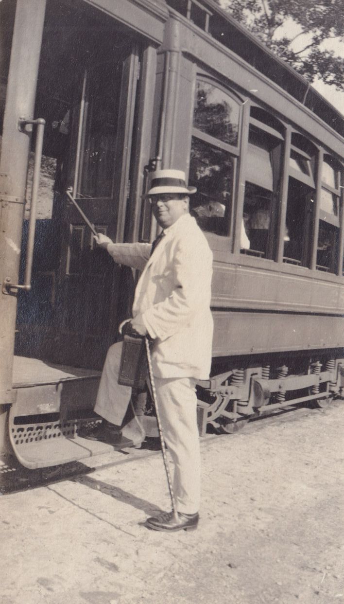 Black-and-white photograph of a man in a light colored suit about to board a passenger train. He has one hand on the railing leading onto the cabin and a cane in the other.