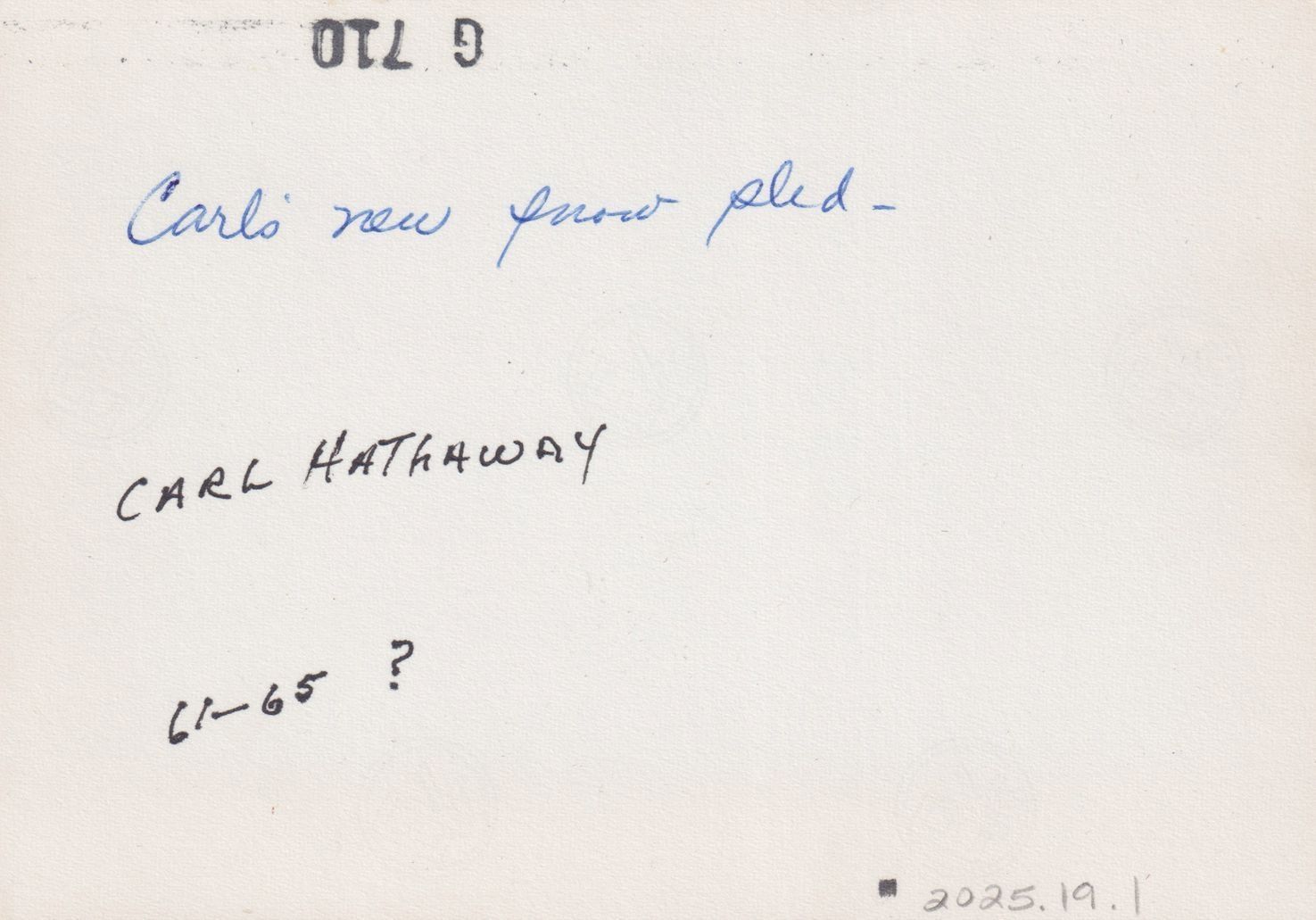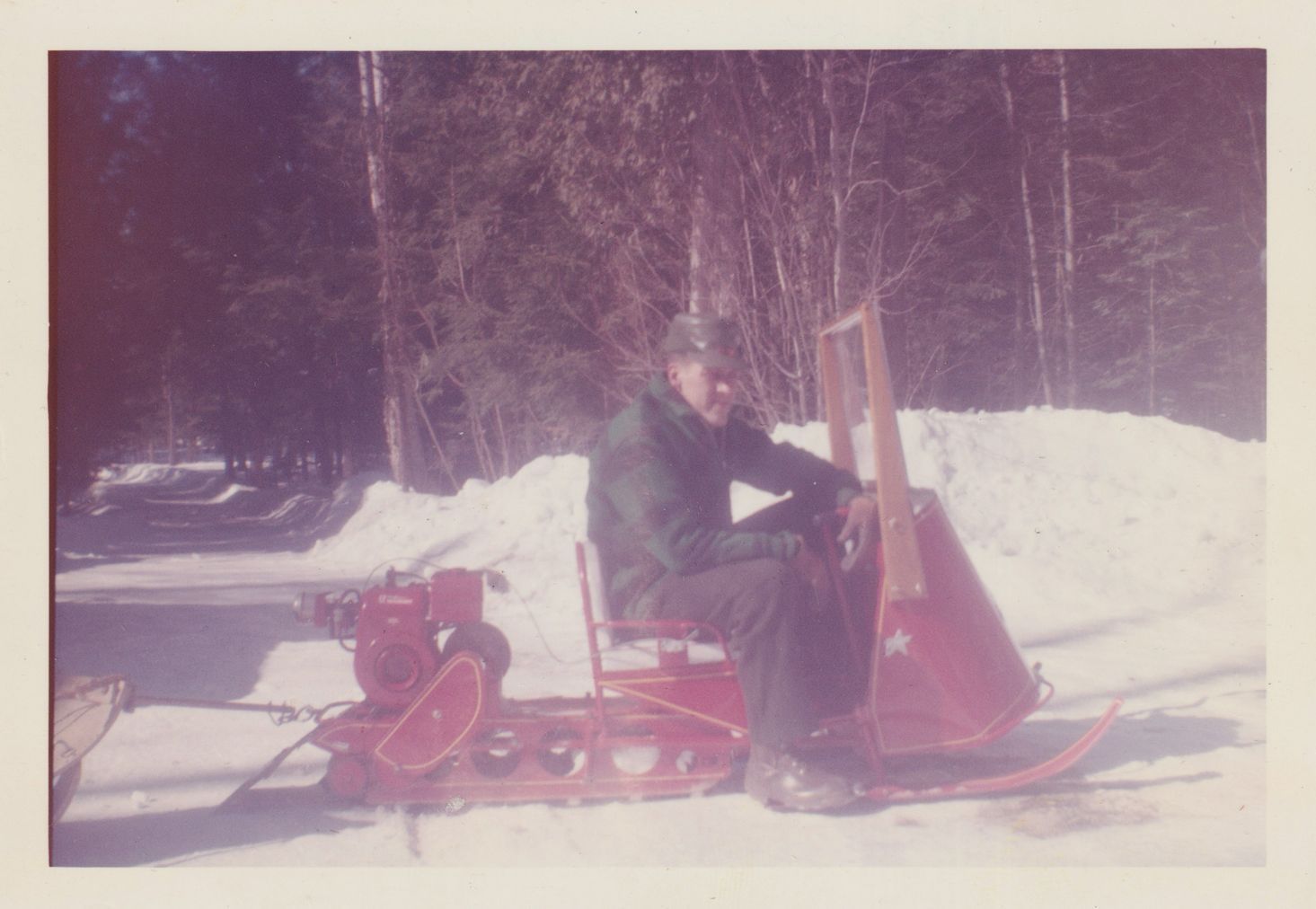 Color photograph of Carl Hathaway seated on an early model red snowmobile in the snow. He is wearing a green plaid jacket. Handwritten note on reverse reads, "Carl's new snow sled," and in different handwriting, "Carl Hathaway, 61-65?"