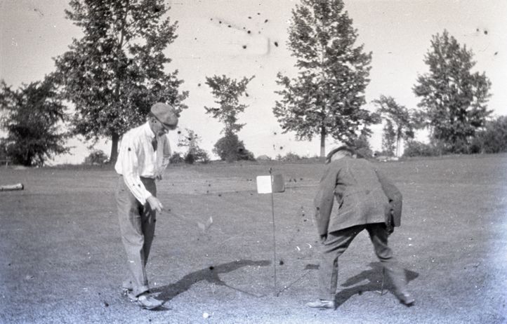 Negative of two unidentified men at a golf hole. Both are holding putters but only one has a golf ball in front of him. Most likely taken by Henry Ives Baldwin. This item is not fully cataloged but has been uploaded so the image is publicly available; if you would like us to prioritize cataloging this item, please contact the HSL Collections team.