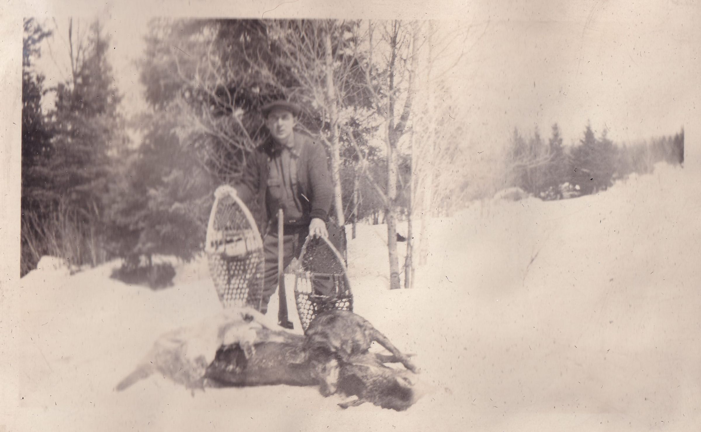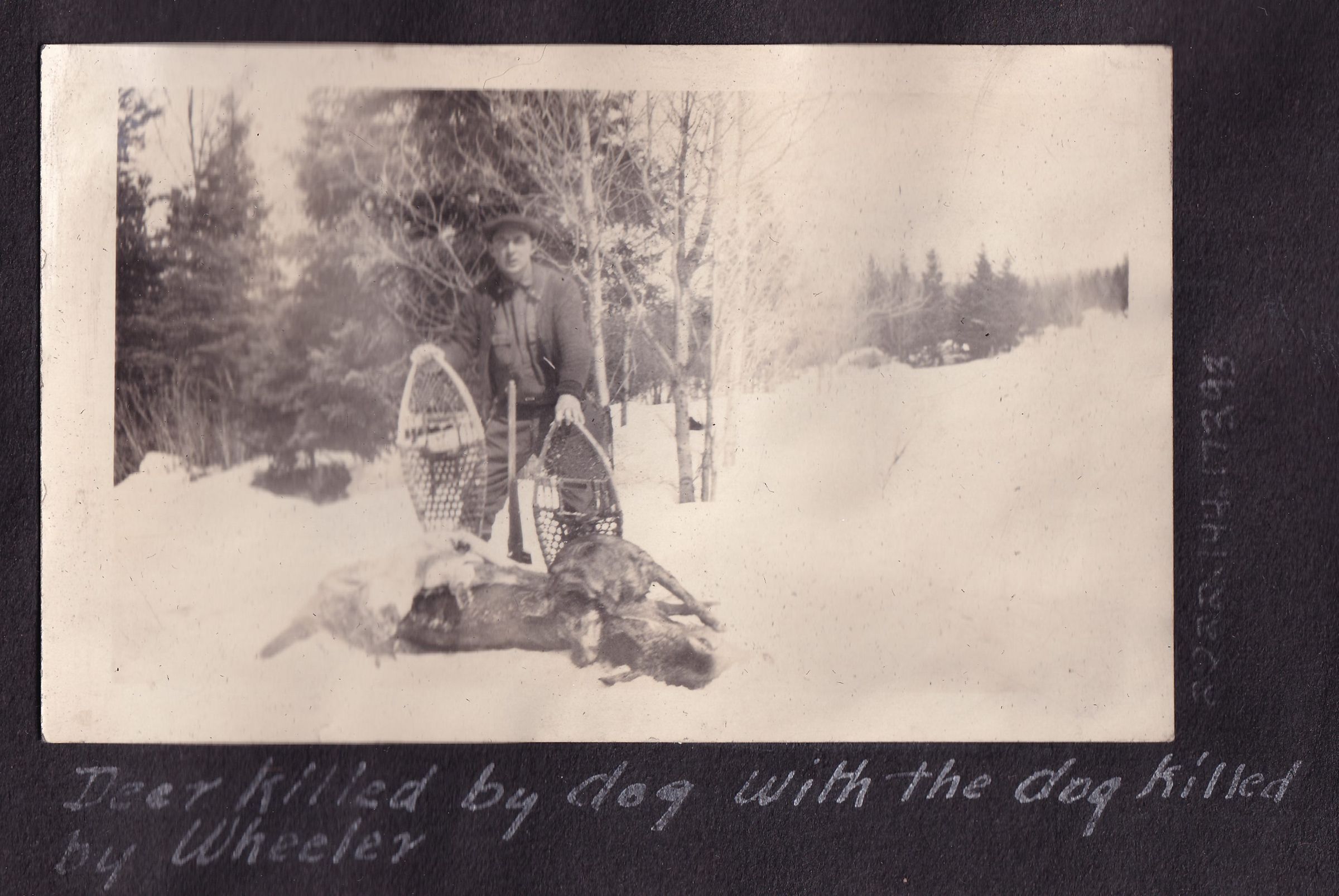 Black-and-White photograph of a dead deer and dead dog draped over a log. There is a man with snowshoes standing behind them. Handwritten caption on page reads, "Deer Killed by Dog with the Dog Killed by Wheeler."