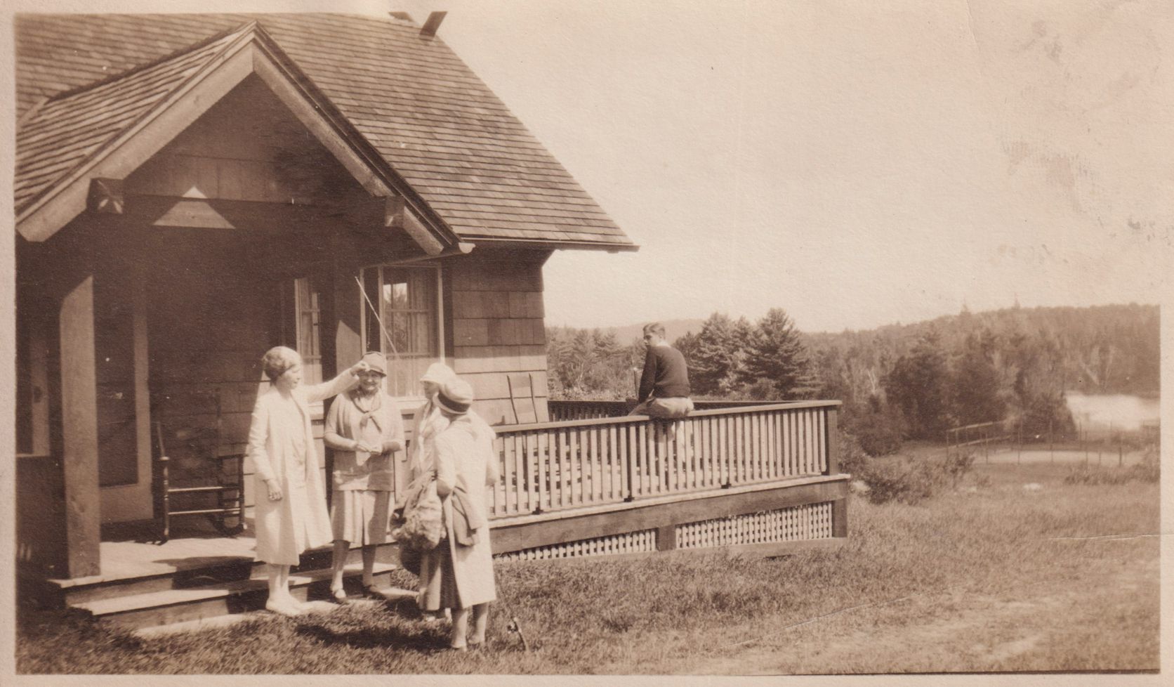 Black-and-White photograph of a group of women standing near the entrance of an unidentified cottage at Bartlett Carry Club. A man can be seen seated on the porch railing behind them. Handwritten note on reverse reads, "Bartlett Carry, August 1928."