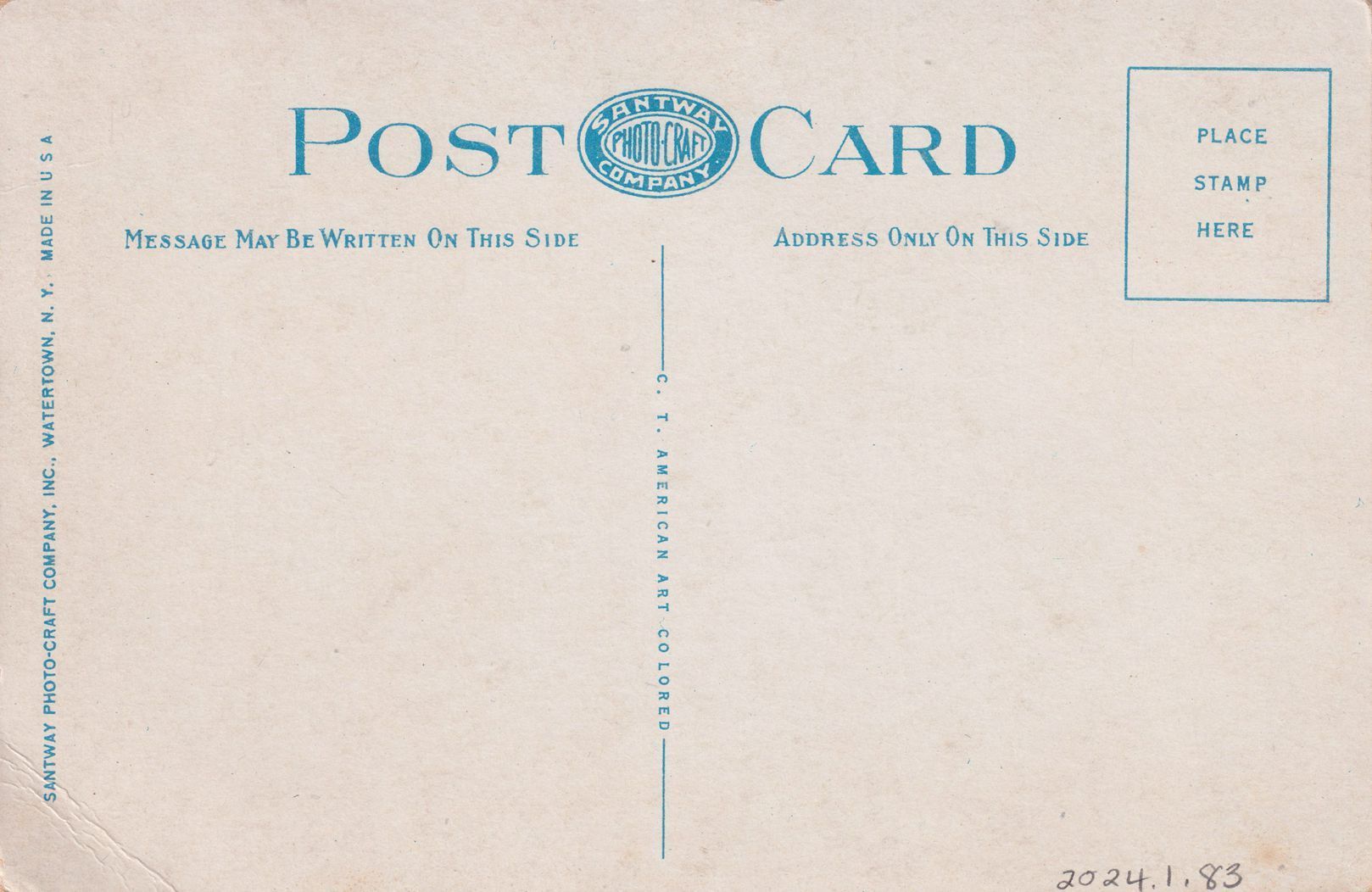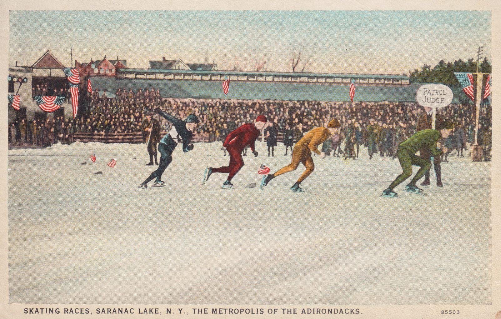 Color postcard showing speed skaters on the ice at Pontiac Bay. Spectators can be seen in the stands behind them. Printed caption on front reads, "Skating Races, Saranac Lake, N.Y., The Metropolis of the Adirondacks." Printed by the Santway Photo-Craft Company, Inc., Watertown, NY. Unused, divided back, white border.Subject Place