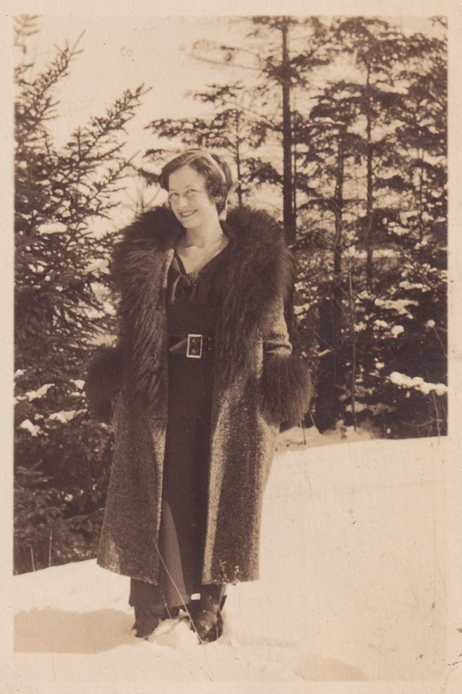 Black-and-White photograph of Amy Jones standing outdoors in the snow. She is dressed up and wearing a woolen coat with a large fur collar and cuffs. Part of album 2024.21.1, kept by Amy Jones and David Blair Jones c. 1930-1934.