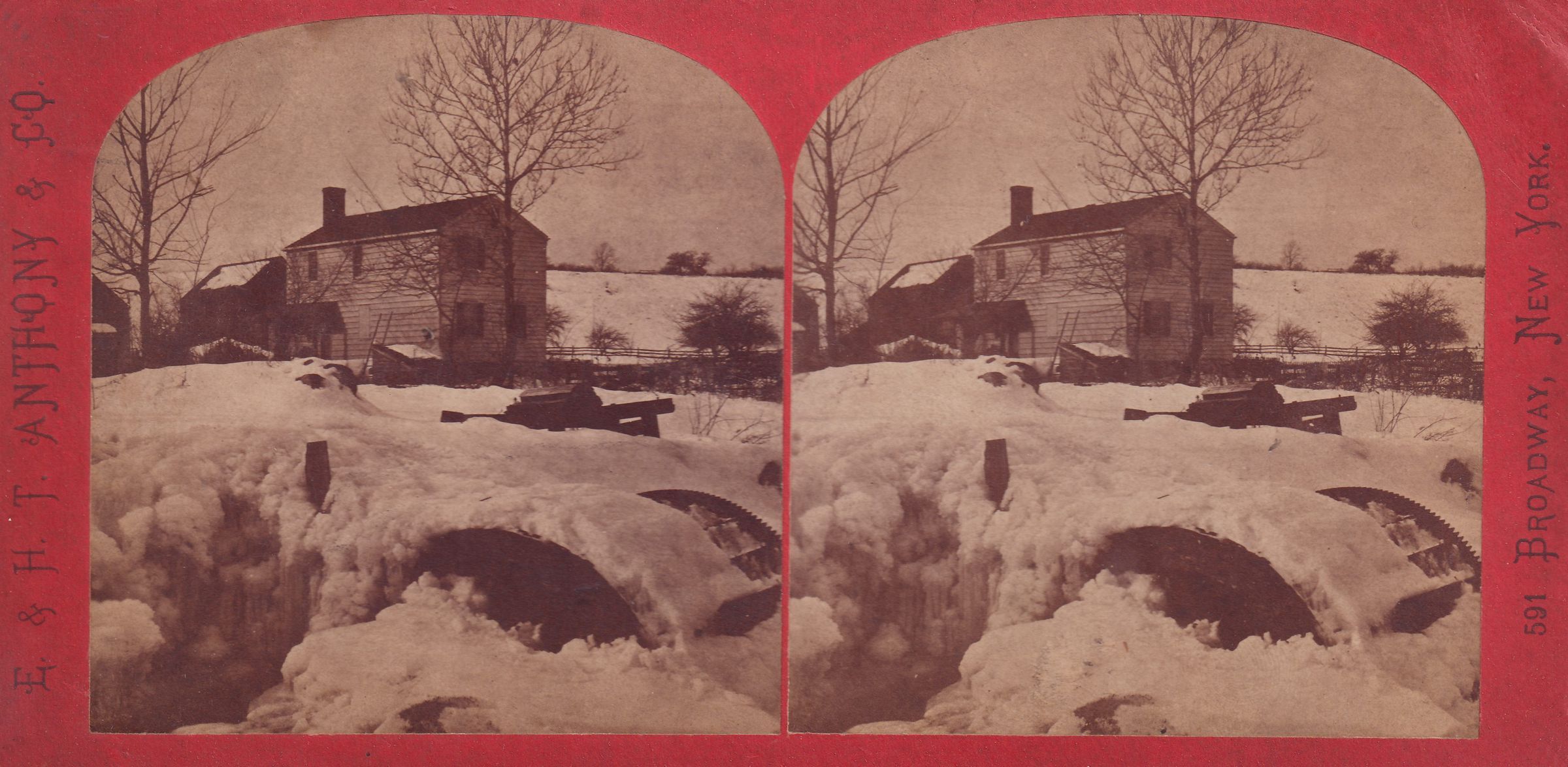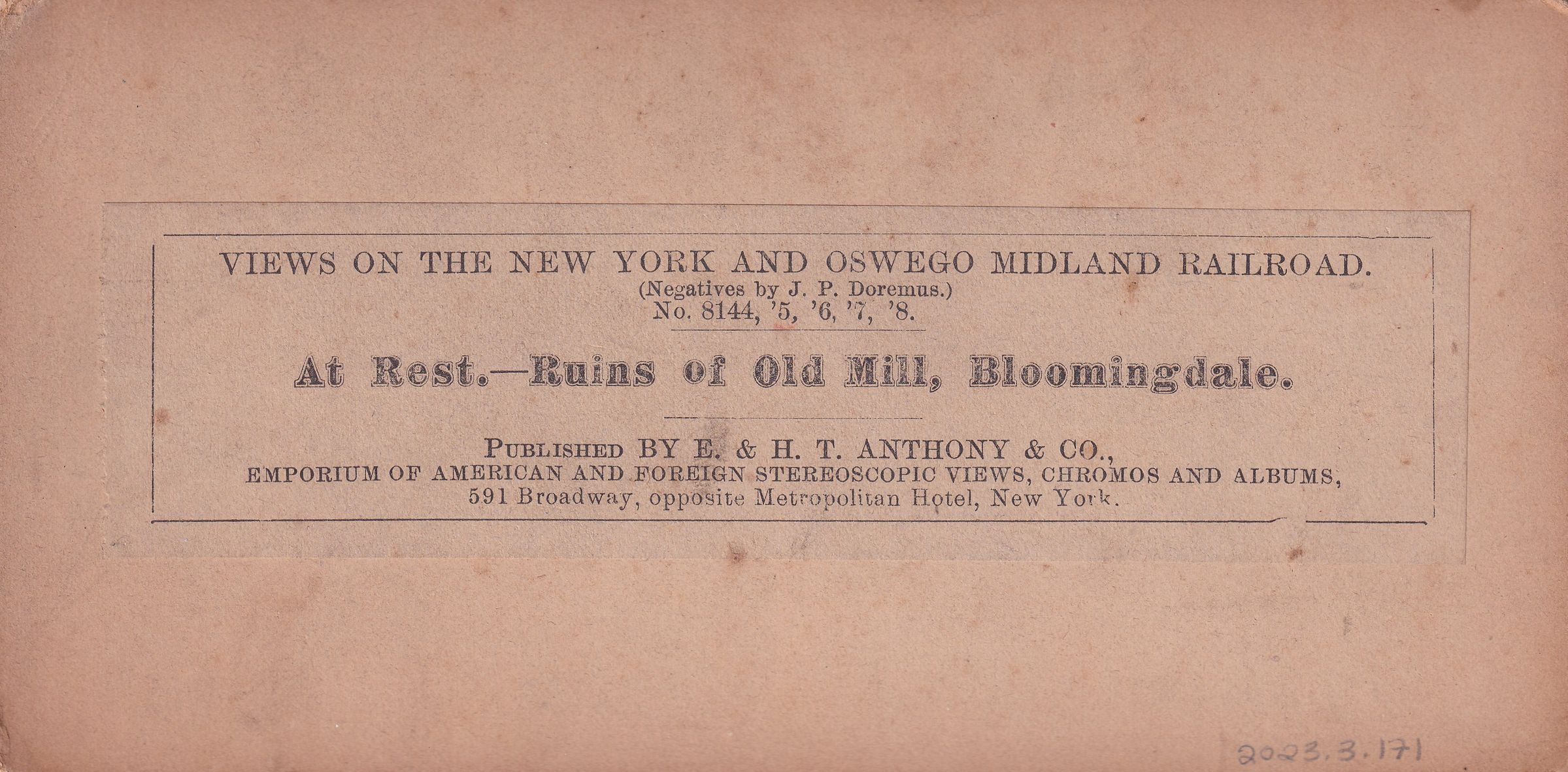 Stereoview image showing a mill wheel covered in snow and ice. There is a building visible in the distance. Printed caption on reverse reads, "At Rest.--Ruins of Old Mill, Bloomingdale." Printed by E. & H. T. Anthony & Co., 591 Broadway, New York. Part of the series, "Views on the New York and Oswego Midland Railroad," negatives by J. P. Doremus. Mounted on orange cardboard backing.Photograph Details