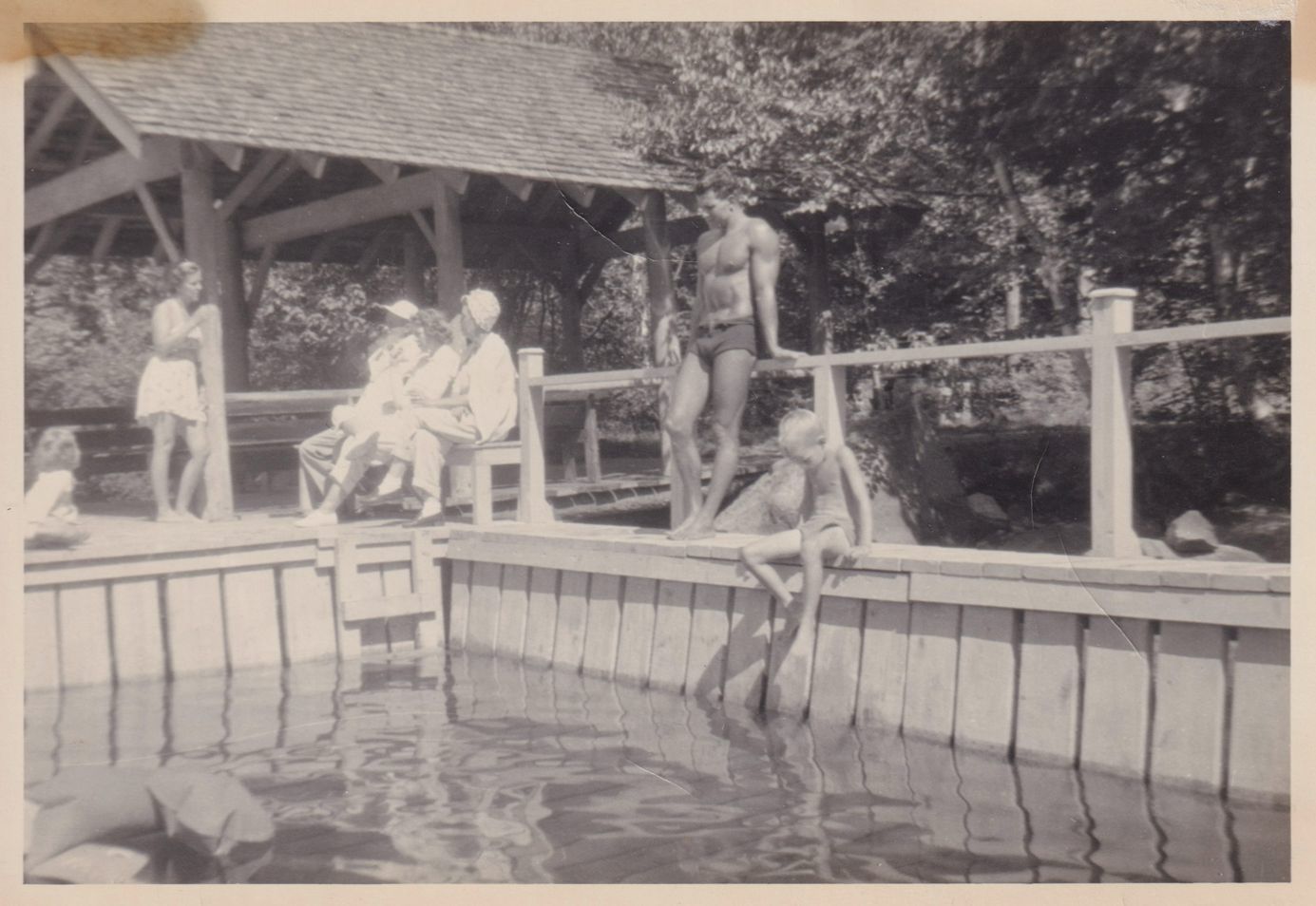 Black-and-White photograph of a group of unidentified people, mostly wearing swimsuits, seated on the dock around the lakeside "pool" at Pyramid Camp (AKA Bartlett Carry Club).