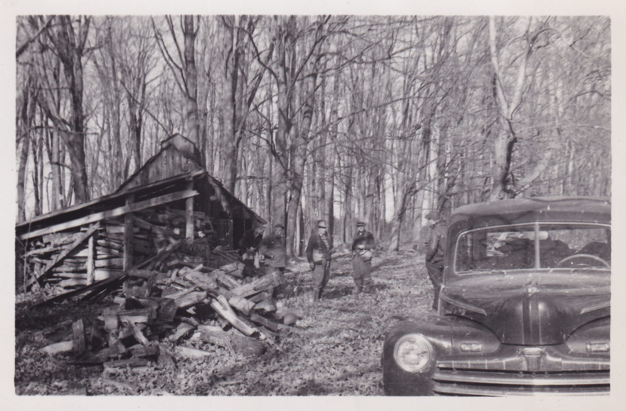 Black-and-White photograph of five unidentified men, standing in the woods near a lean-to of firewood. There is a car visible in the foreground.