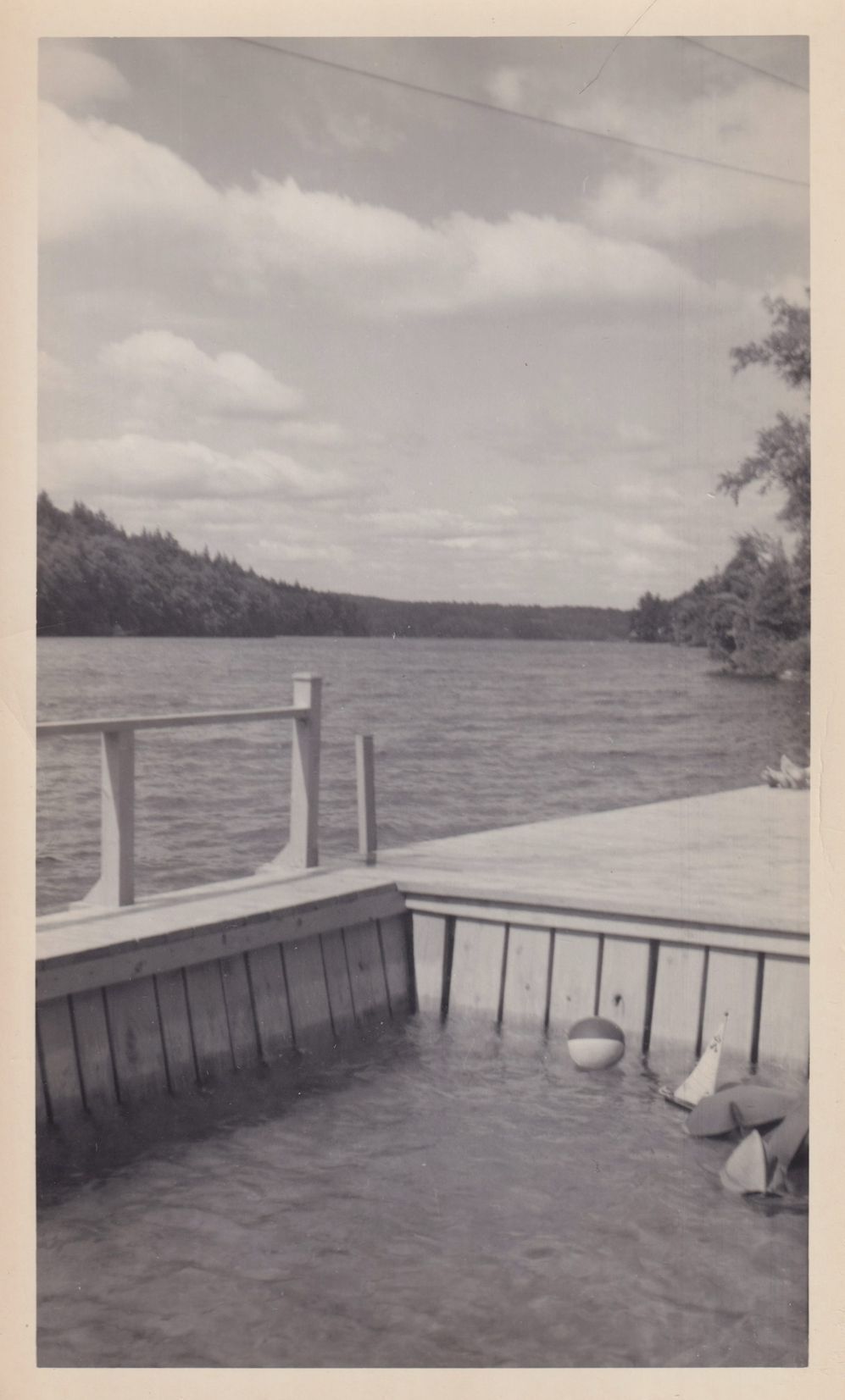 Black-and-White photograph showing a dock surrounding a "pool" on the lake at the Bartlett Carry Club.