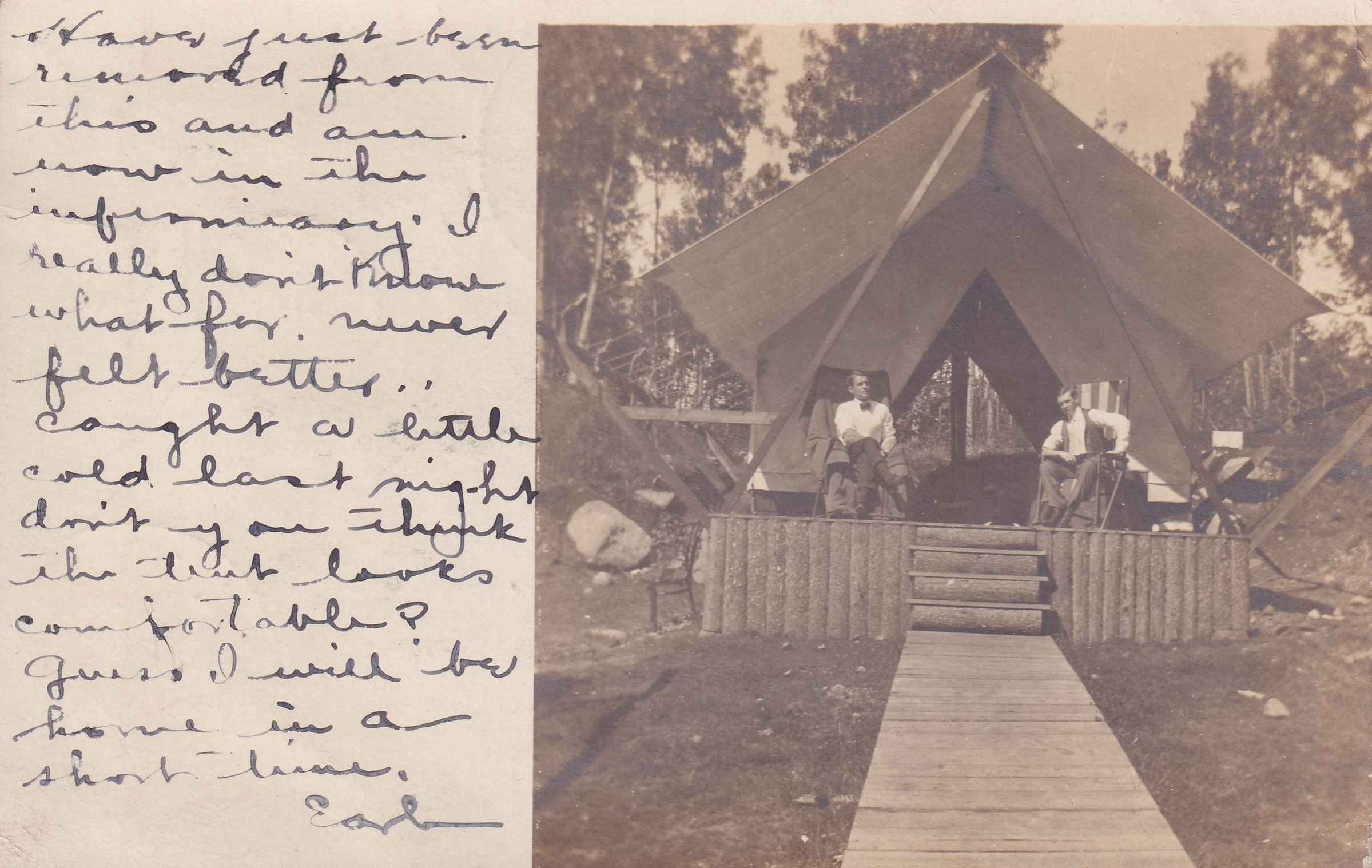 Photograph postcard showing two men on the porch of a platform tent. They are both seated in canvas deck chairs. Used, undivided back, white space at left for message. Handwritten message on front reads, “Have just been removed from this and am now in the infirmary. I really don't know what for. Never felt better... Caught a little cold last night. Don't you think the tent looks comfortable? Guess I will be home in a short time. Earl.” Mailed to Miss Florence May Powell, New Baltimore, Greene County, N.Y.Subject Place