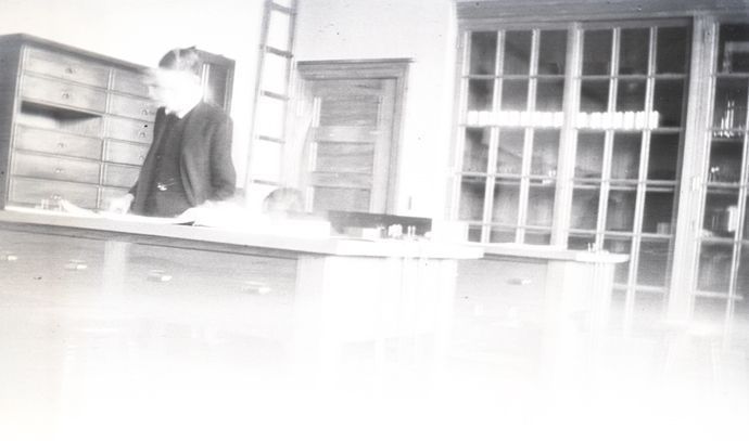 Negative of an unidentified young man in a classroom. Most likely taken by Mary Ives Baldwin. This item is not fully cataloged but has been uploaded so the image is publicly available; if you would like us to prioritize cataloging this item, please contact the HSL Collections team.