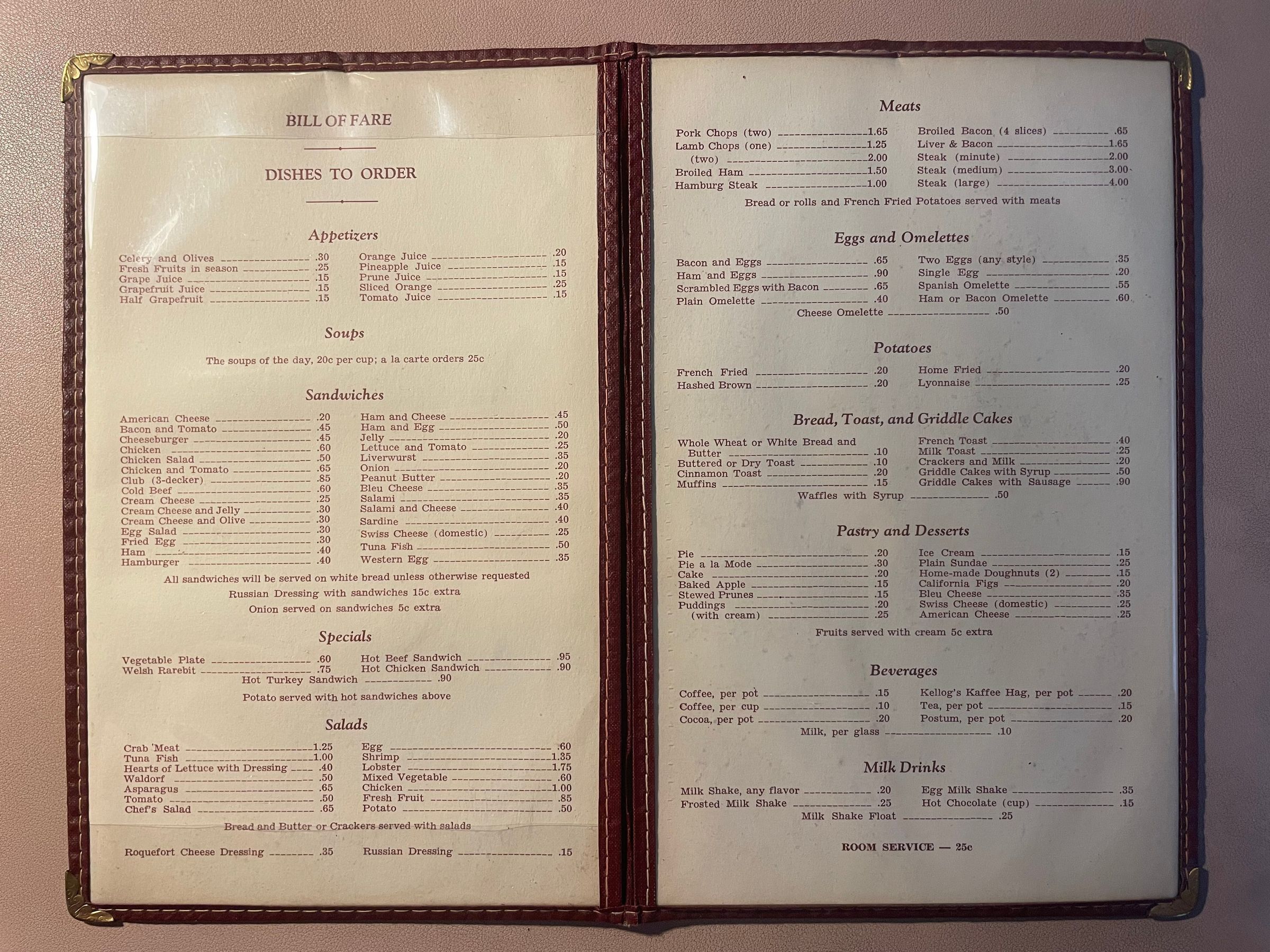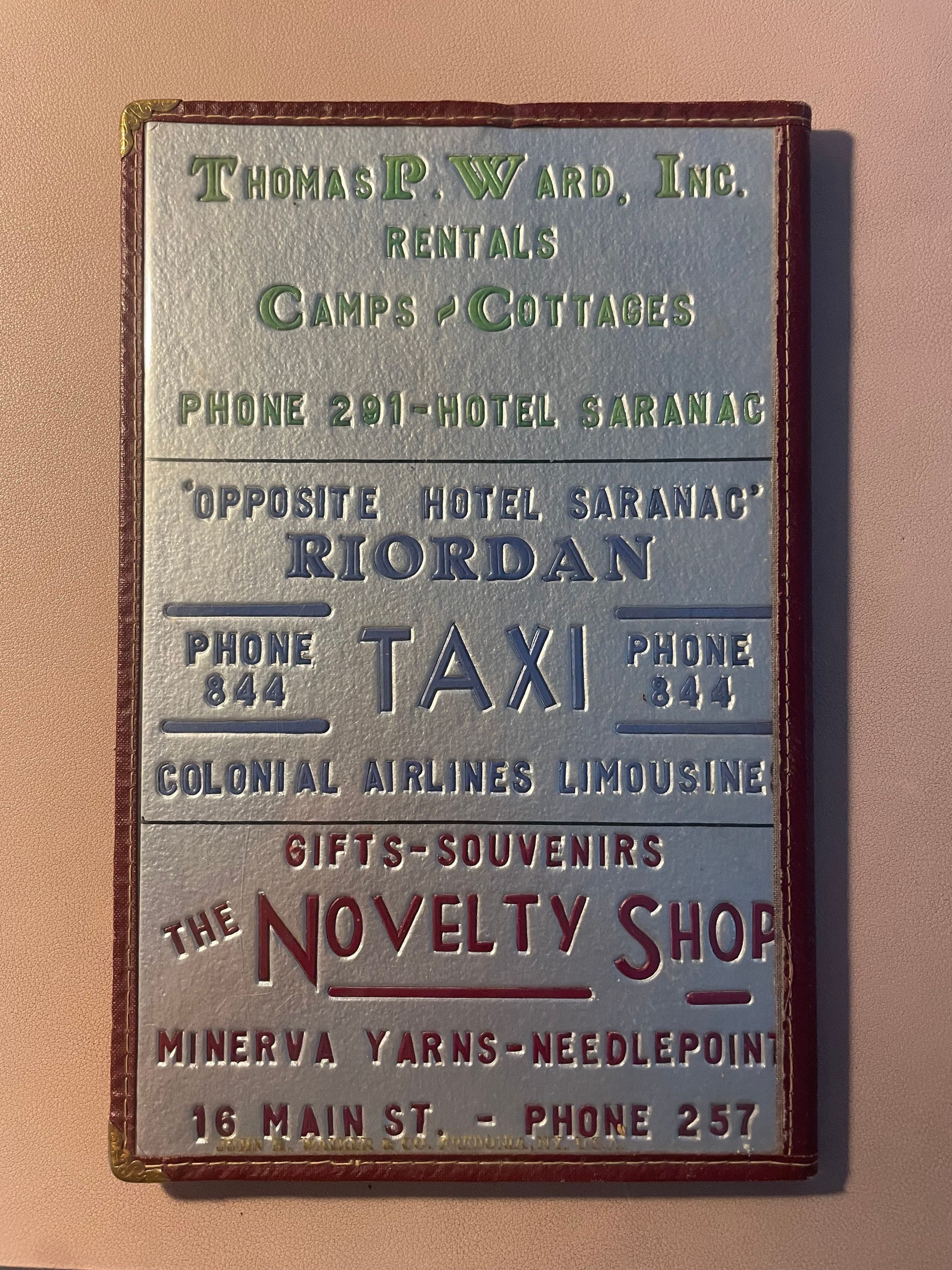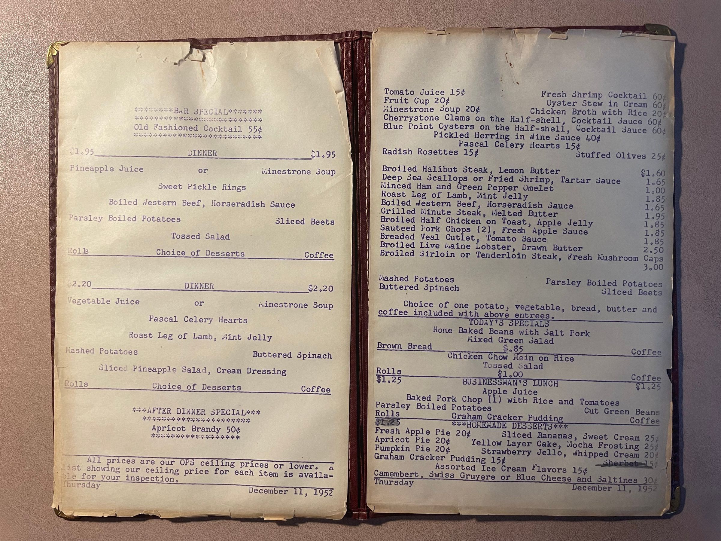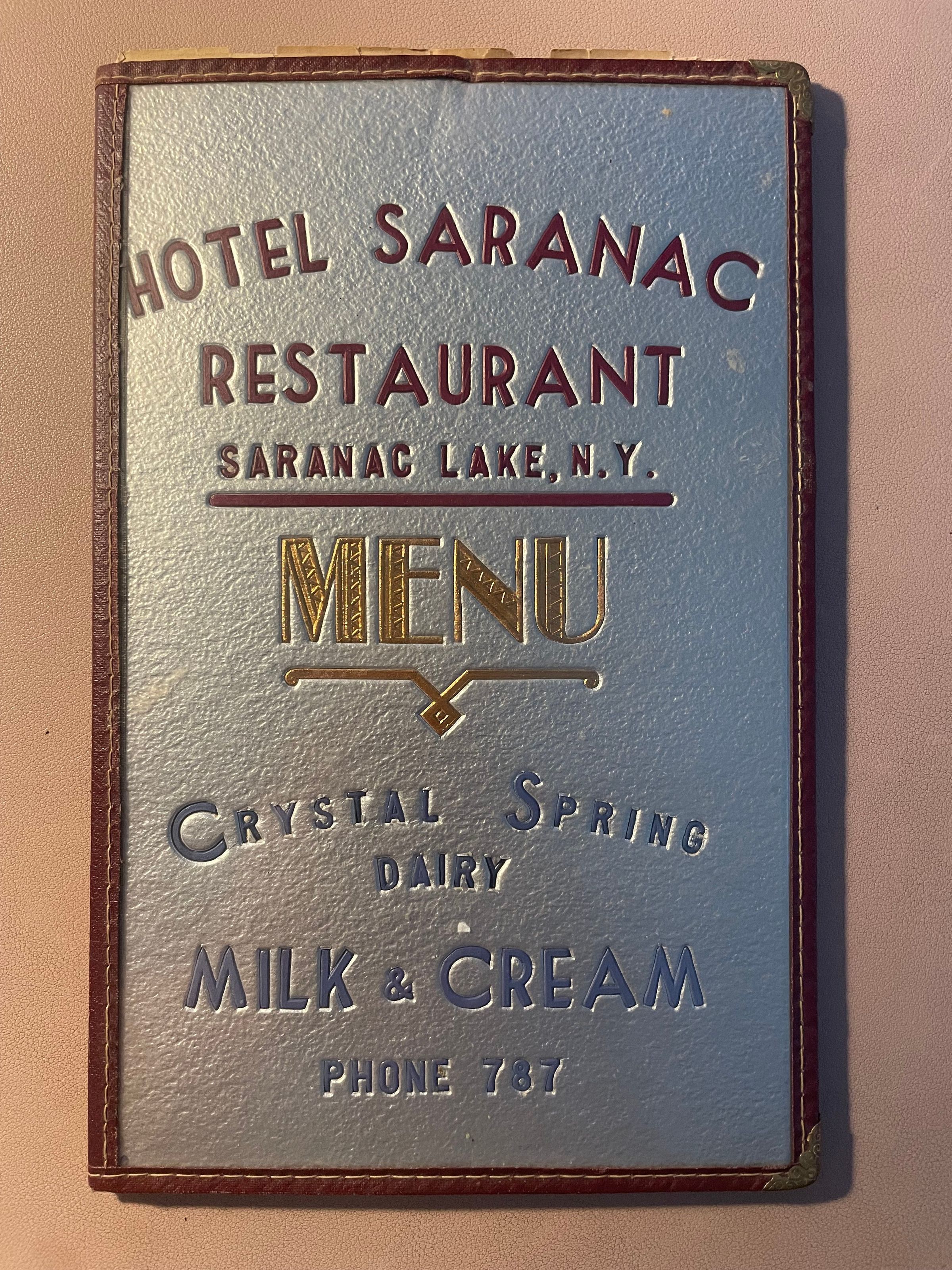Menu from the restaurant at Hotel Saranac, 1952. Silver board covers in clear plastic menu sleeves. Covers are embossed with ads for Crystal Spring Dairy, Thomas P. Ward, Inc, Riordan Taxi, and the Novelty Shop. Sleeves are edged in maroon sewn tape and decorative metal corners. Inside of menu has two pages of standard menus, as well as two inserted specials pages. Specials pages are dated December 11, 1952.Lexicon