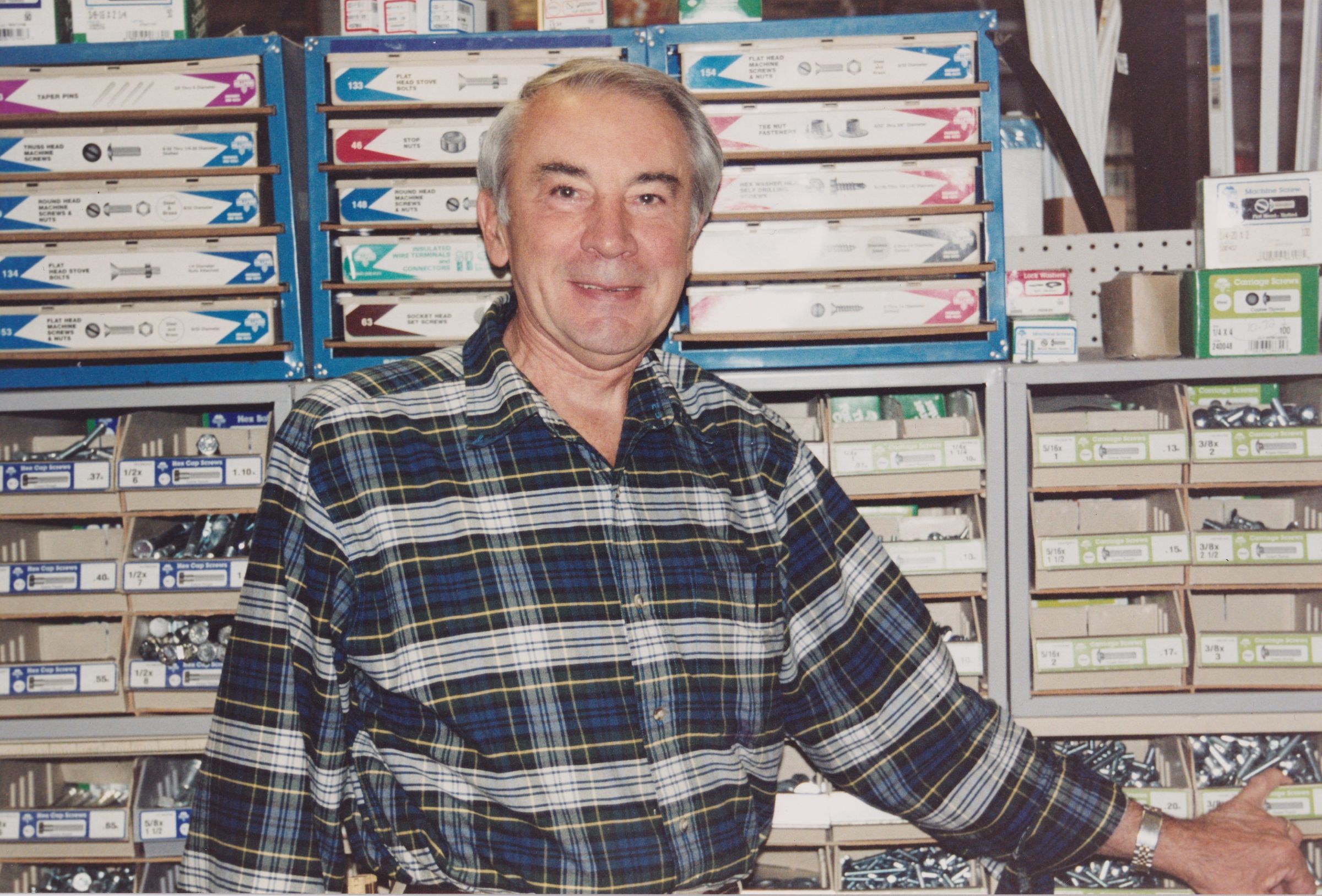 Color photograph of Phil Lalande inside of his business, Gendron Lumber Company. Portrait taken by Mary Lou Hanpeter Banks as part of her Soul Proprietor exhibition.