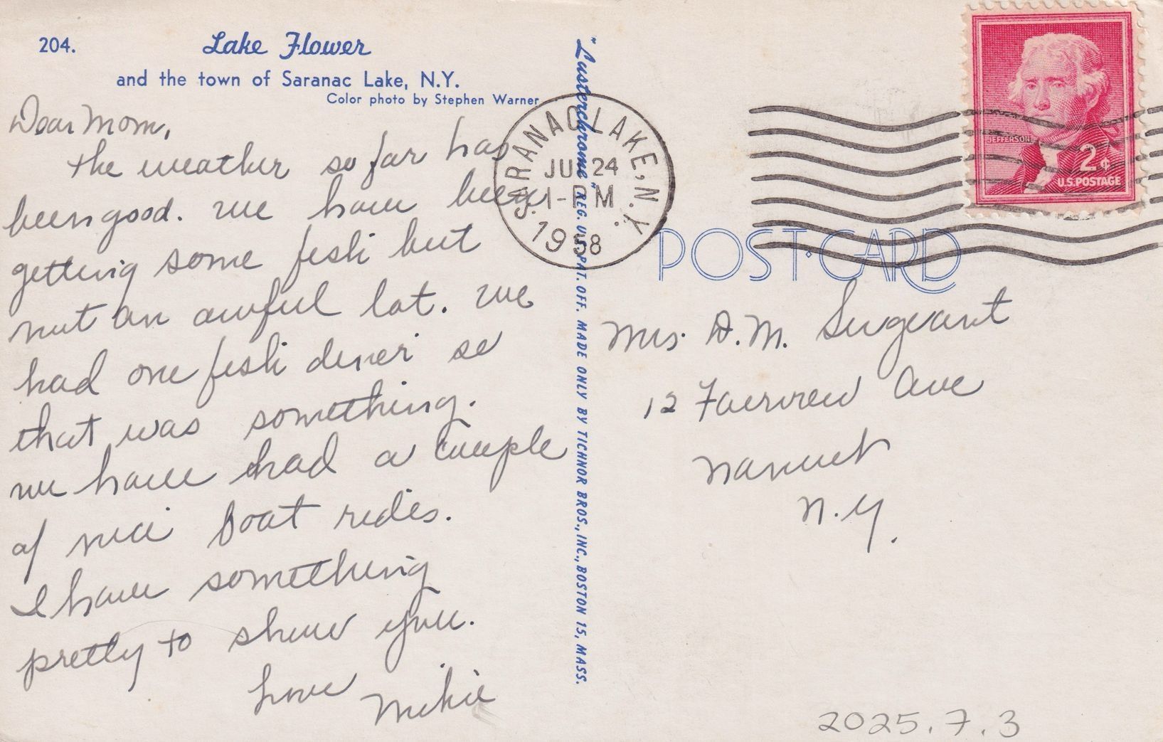 Handwritten message on reverse reads, "Dear Mom, The weather so far has been good. We have been getting some fish but not an awful lot. We had one fish dinner so that was something. We have had a couple of nice boat rides. I have something pretty to show you. Love Mikie." Mailed to Mrs. D. M. Surgeant, 12 Fairview Ave., Nanuet [?], N. Y.Subject Place