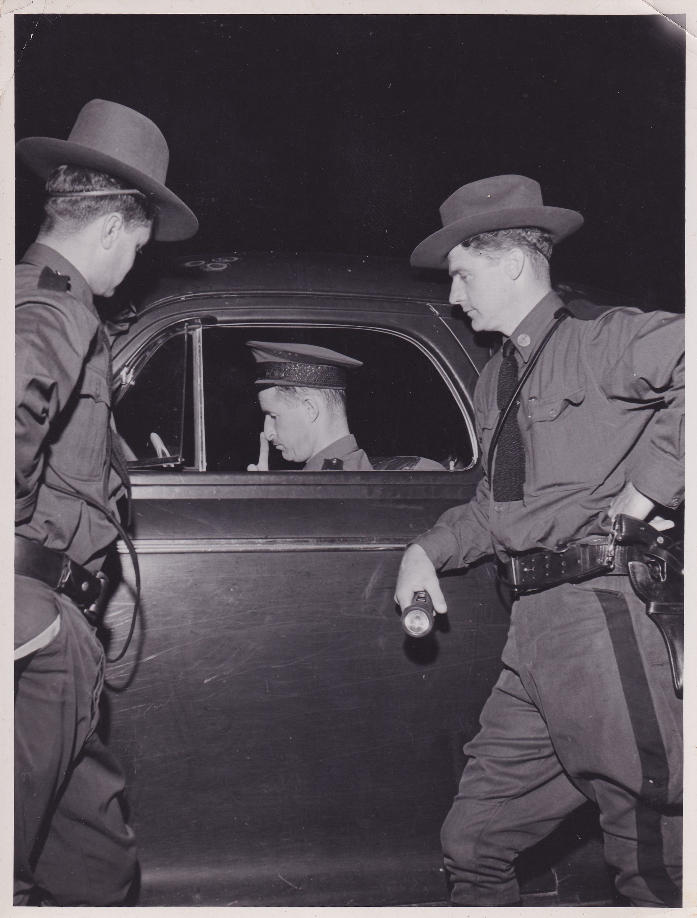 Black-and-White photograph of three men in game warden or trooper uniforms. One man is seated inside a car, touching his nose. The other two are leaning on the car and looking in the window.