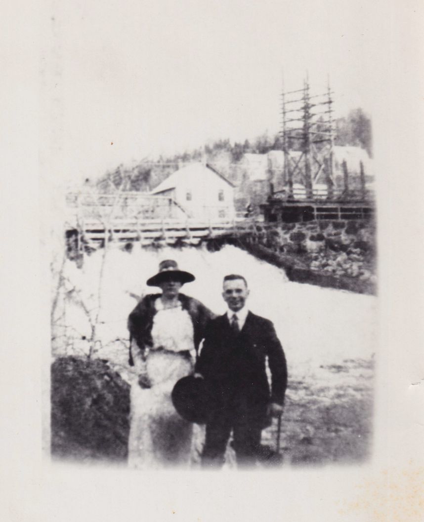 Black-and-White photograph of a man and a woman standing by a river, possibly the Saranac River. A dam and bridge are visible behind them. The photograph was likely printed by Kollecker's Kodak and Gift Shop.