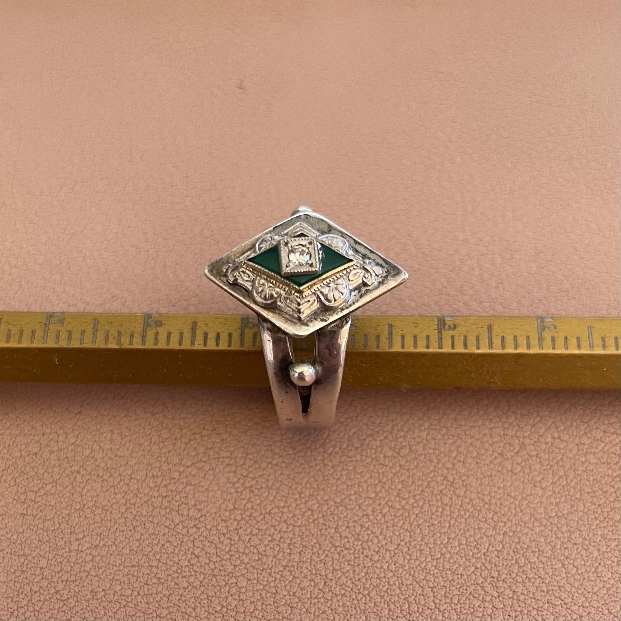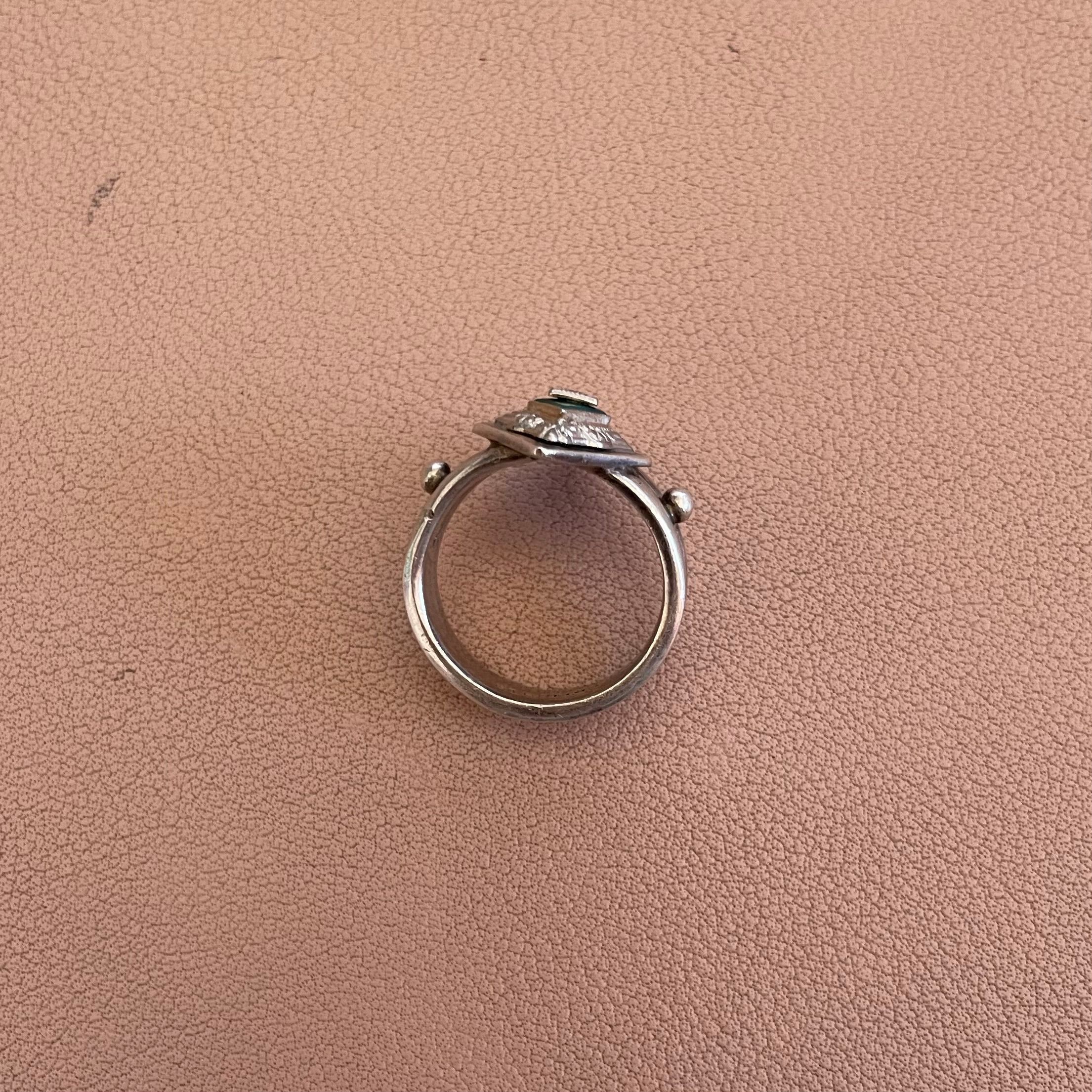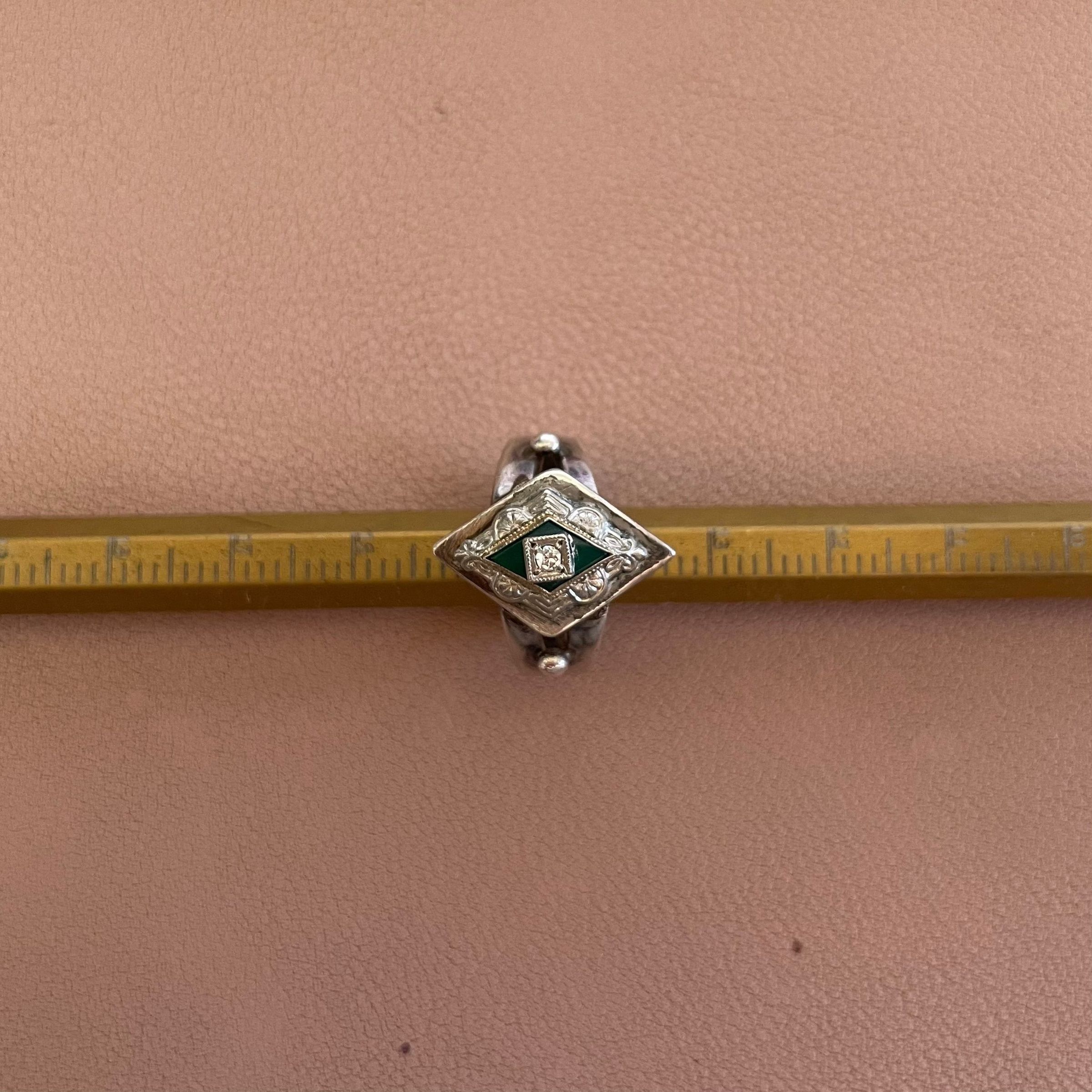 Custom silver ring created by Temming Art Studio, using Irving Edelberg's tie pin. Features diamond-shaped detail supporting a green stone topped with a small diamond. Attached to a thick silver band with two silver ball details at shoulders. Stamped "Handwrought" inside band.