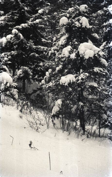 Negative of snow covered trees on an incline. Most likely taken by Mary Ives Baldwin. This item is not fully cataloged but has been uploaded so the image is publicly available; if you would like us to prioritize cataloging this item, please contact the HSL Collections team.