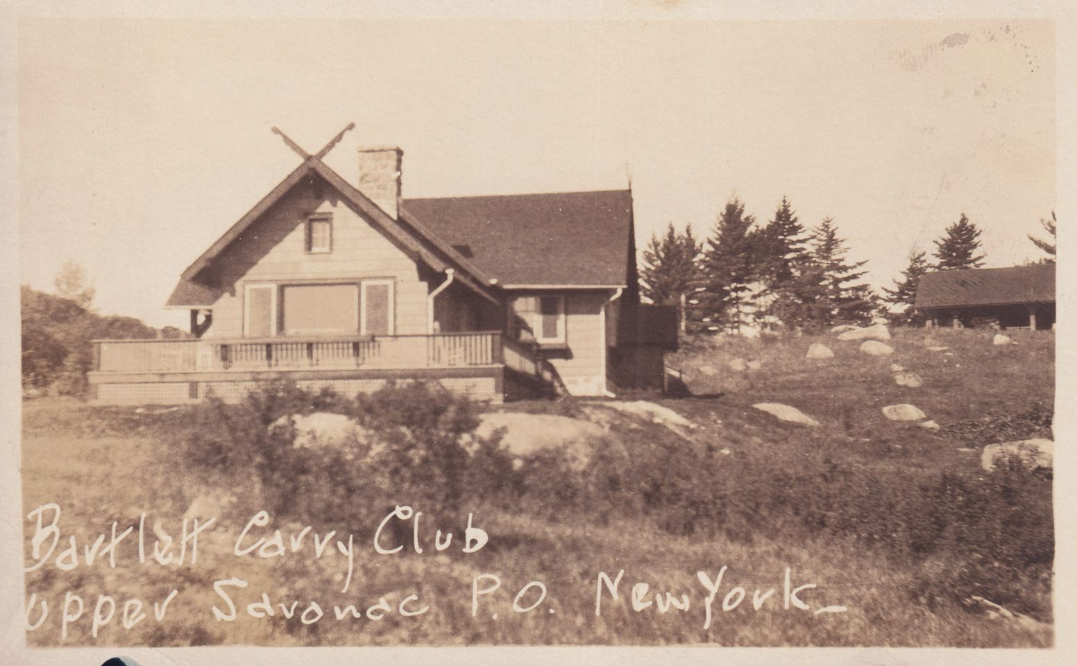 Black-and-White photograph postcard showing an unidentified cottage at Bartlett Carry Club. A handwritten note, "Bartlett Carry Club, Upper Saranac P. O., New York," is printed on the photograph. No photographer's mark. Unused, divided back, white border.Subject Place