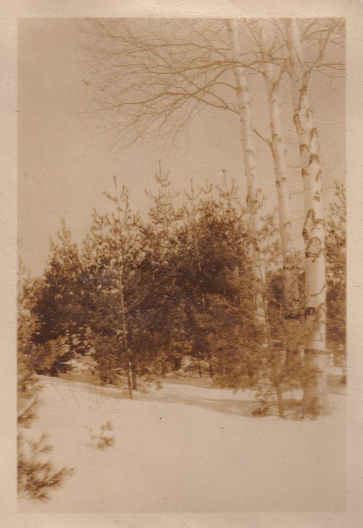Black-and-White photograph of a snowy landscape with birch trees. Part of album 2024.21.1, kept by Amy Jones and David Blair Jones c. 1930-1934.