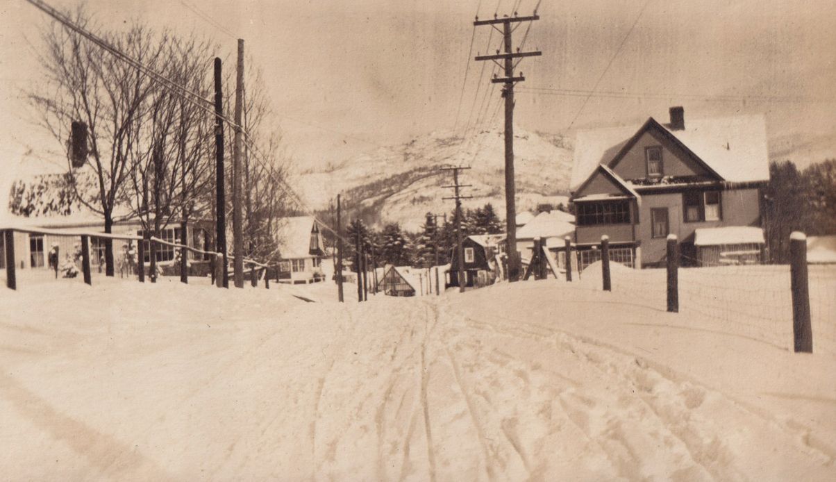 Black-and-white photograph of a snow-covered road as it goes downhill. There are cure cottages visible on either side of the road, as well as telephone poles running wires.