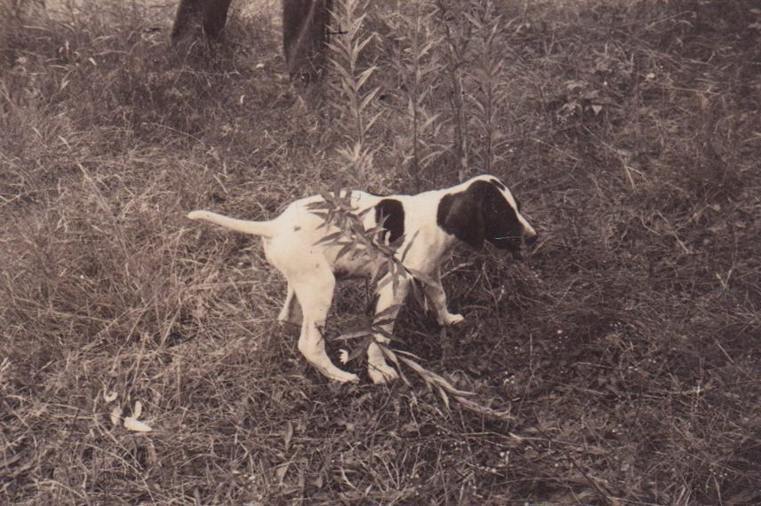 Black-and-White photograph of a hunting dog standing in the grass. Printed from a contact sheet.