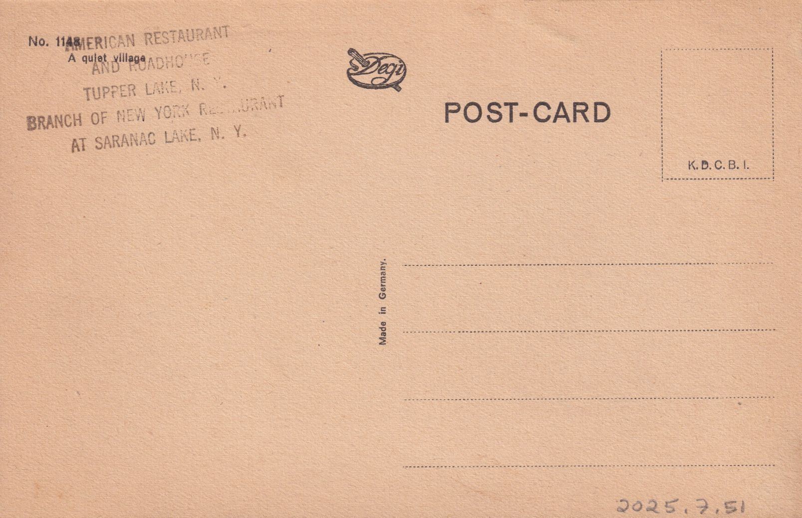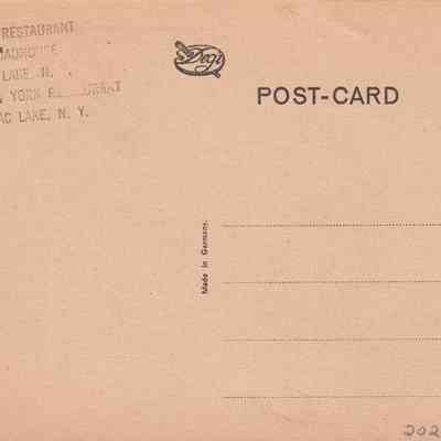 Color textured postcard showing an image of a tudor-style cottage. Printed caption on reverse reads, "A Quiet Village," and "American Restaurant and Roadhouse, Tupper Lake, N. Y, Branch of New York Restaurant at Saranac Lake, N.Y.," is stamped underneath. Made in Germany. Unused, divided back.Lexicon