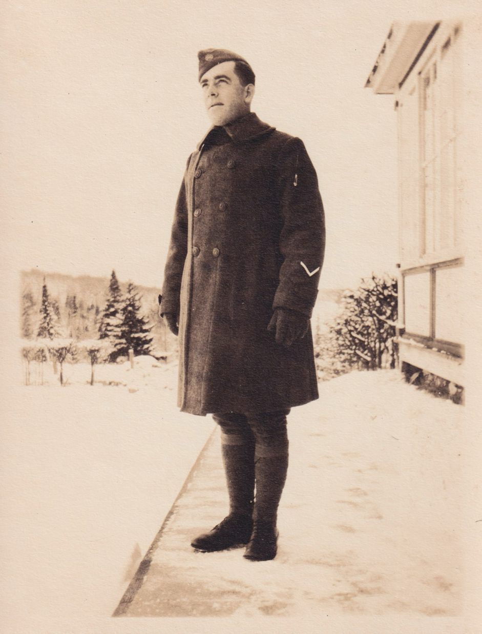 Black-and-White photograph of a man in military uniform standing on a snowy sidewalk next to a building. Cure porch windows are visible next to him. The photograph was likely printed by Kollecker's Kodak and Gift Shop.