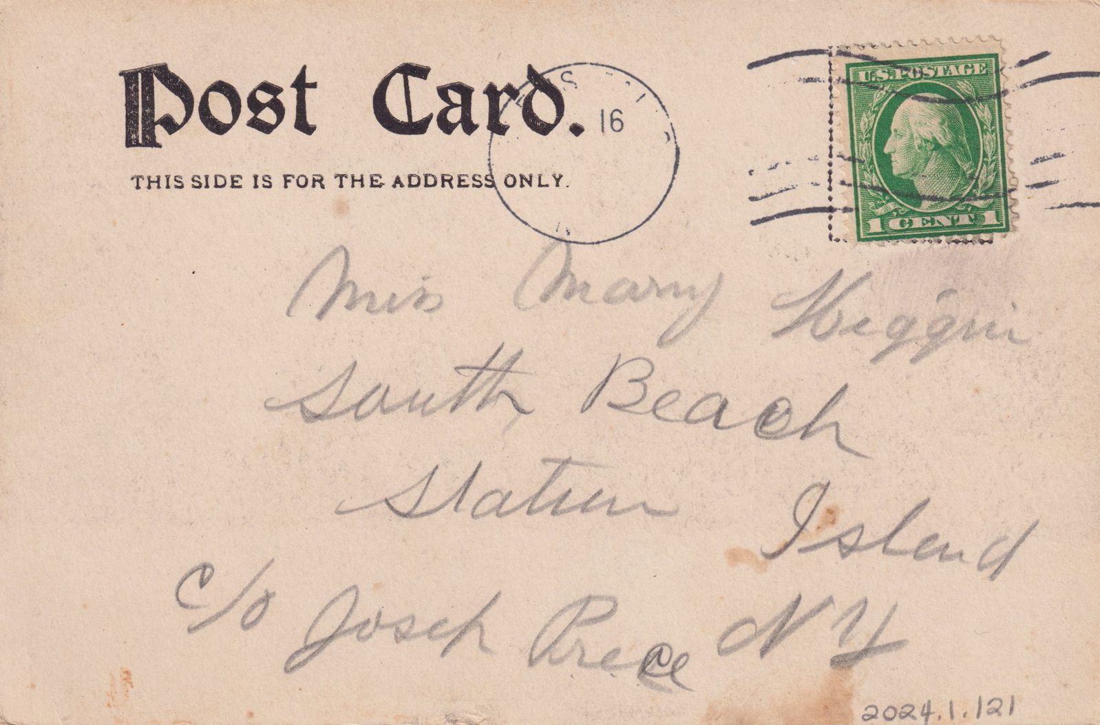 Black-and-White postcard showing a view looking toward the Casino at Saranac Inn on Upper Saranac Lake. The main hotel building can be seen in the distance. Printed caption on front reads, "Upper Saranac Lake, Casino & Saranac Inn." No printer's mark. Used, undivided back, white space on bottom of front side for message, postmark illegible. Handwritten message on front reads, "To my [?] girl, from Amy Ed [?]." Mailed to Miss Mary Wiggin, South Beach, Staten Island, NY, c/o Joseph Price.Subject Place