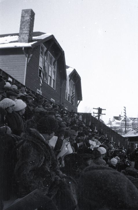 Negative of a crowd of spectators sitting in the stands around the Pontiac Bay ice rink. The negative was taken from among the spectators. Most likely taken by Mary Ives Baldwin. This item is not fully cataloged but has been uploaded so the image is publicly available; if you would like us to prioritize cataloging this item, please contact the HSL Collections team.